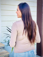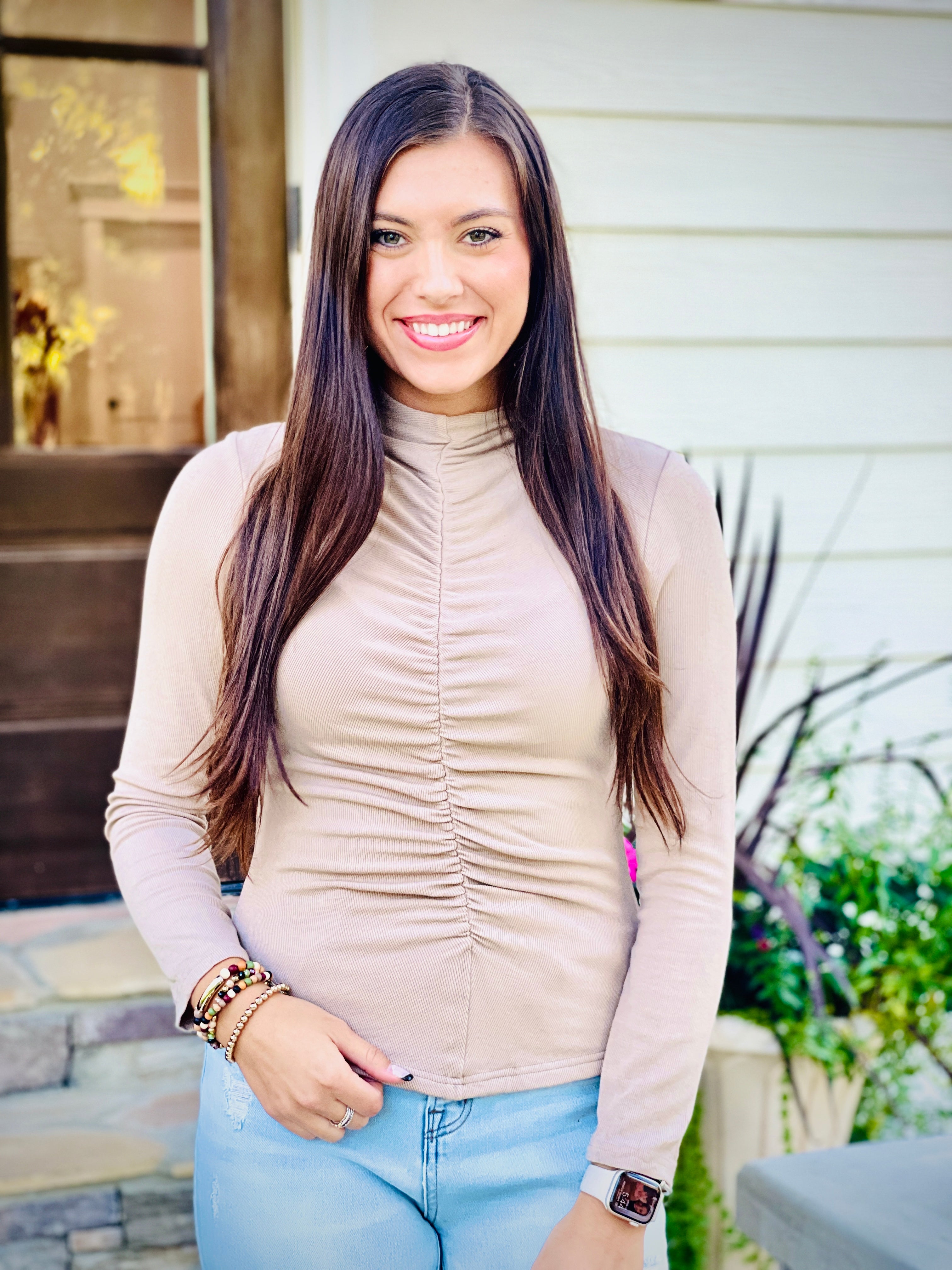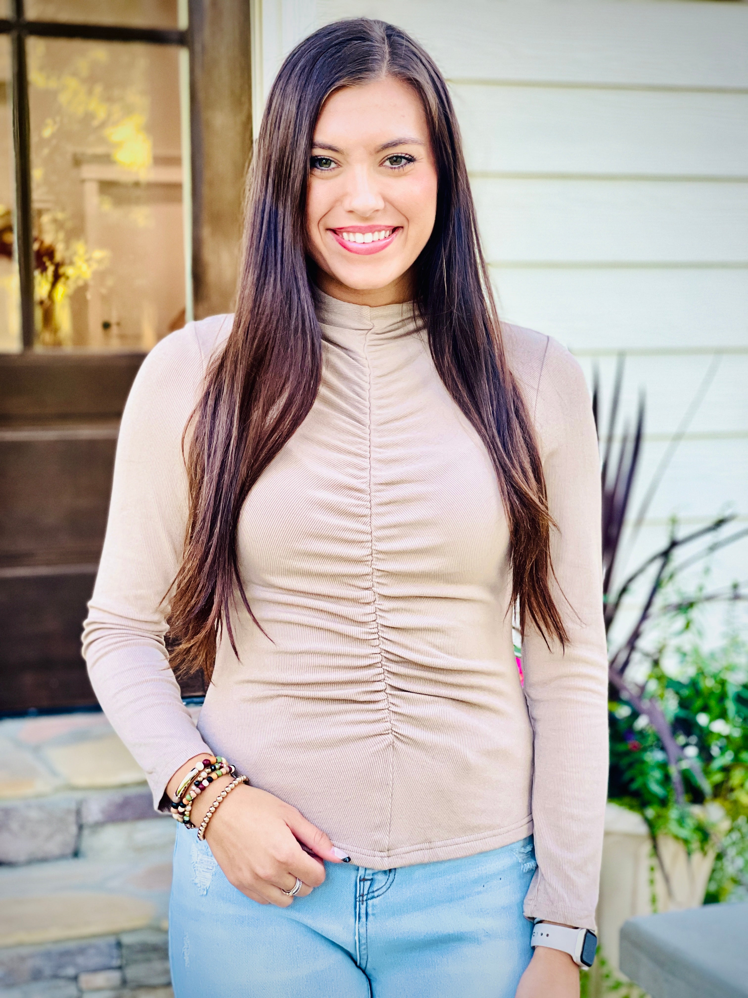 This lightweight, ribbed knit long sleeve makes everyday basics a stylish statement. Featuring a mock neck and shirred detail at the center, it is lined for extra coverage and comfort. Perfect for cool-weather dressing.