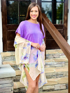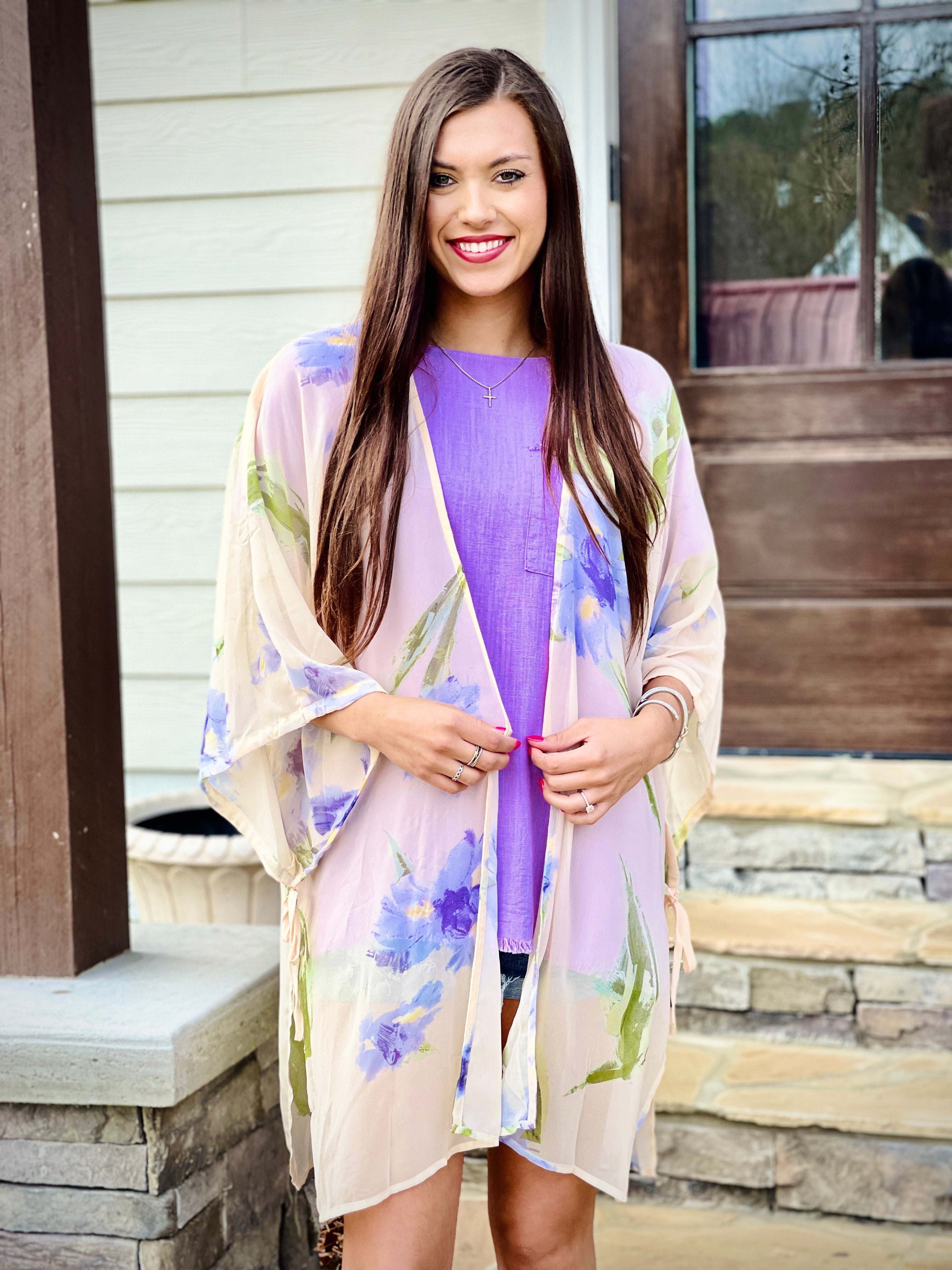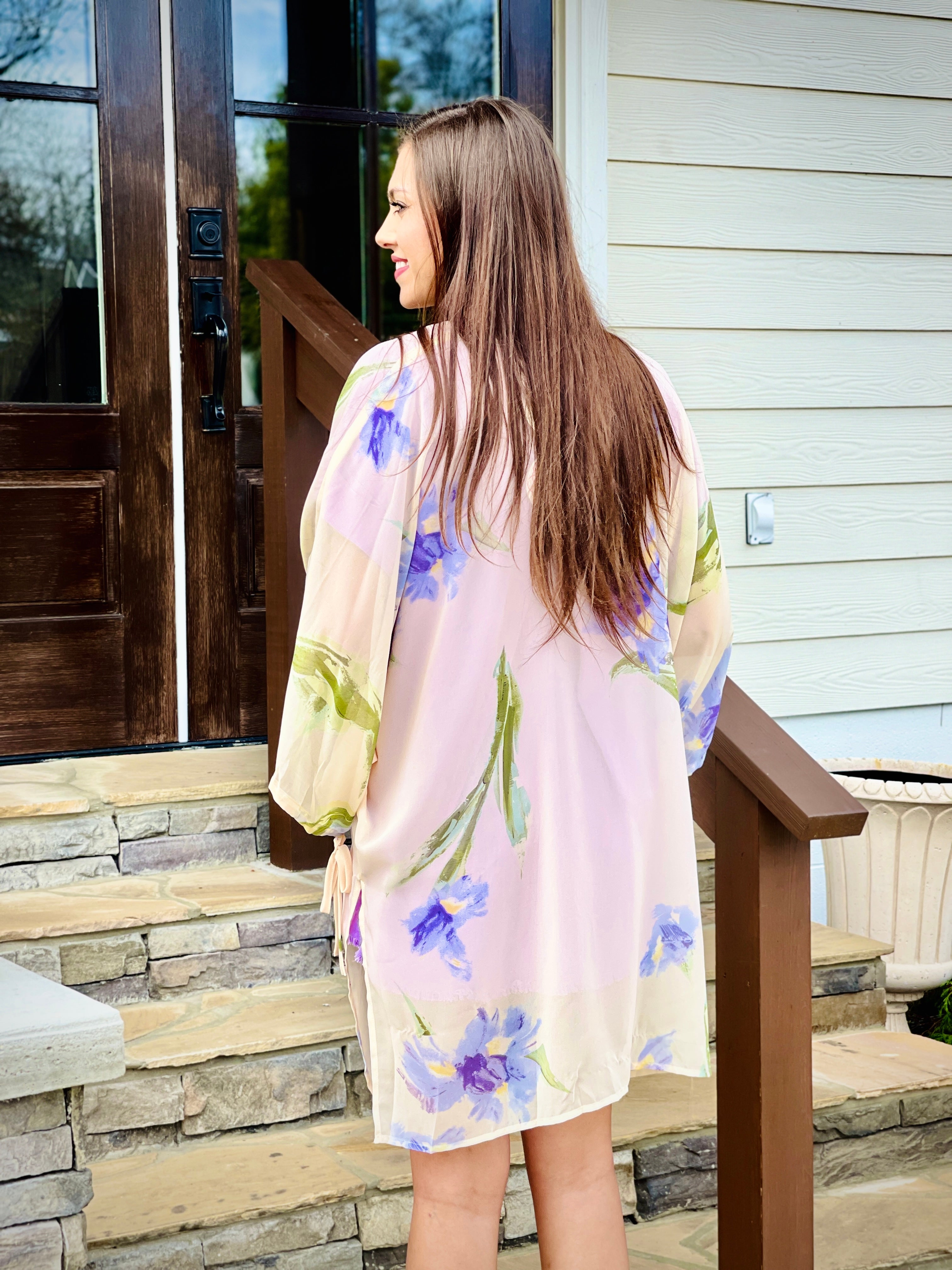 The Floral Print Kimono is a versatile statement piece for any occasion. With its elegant floral print and adjustable self-tie detail at the cuff, it is perfect for adding a touch of sophistication to any outfit. Made from a lightweight and sheer fabric, it is comfortable and stylish. The open 3/4 sleeves add a fashionable touch to this must-have kimono.