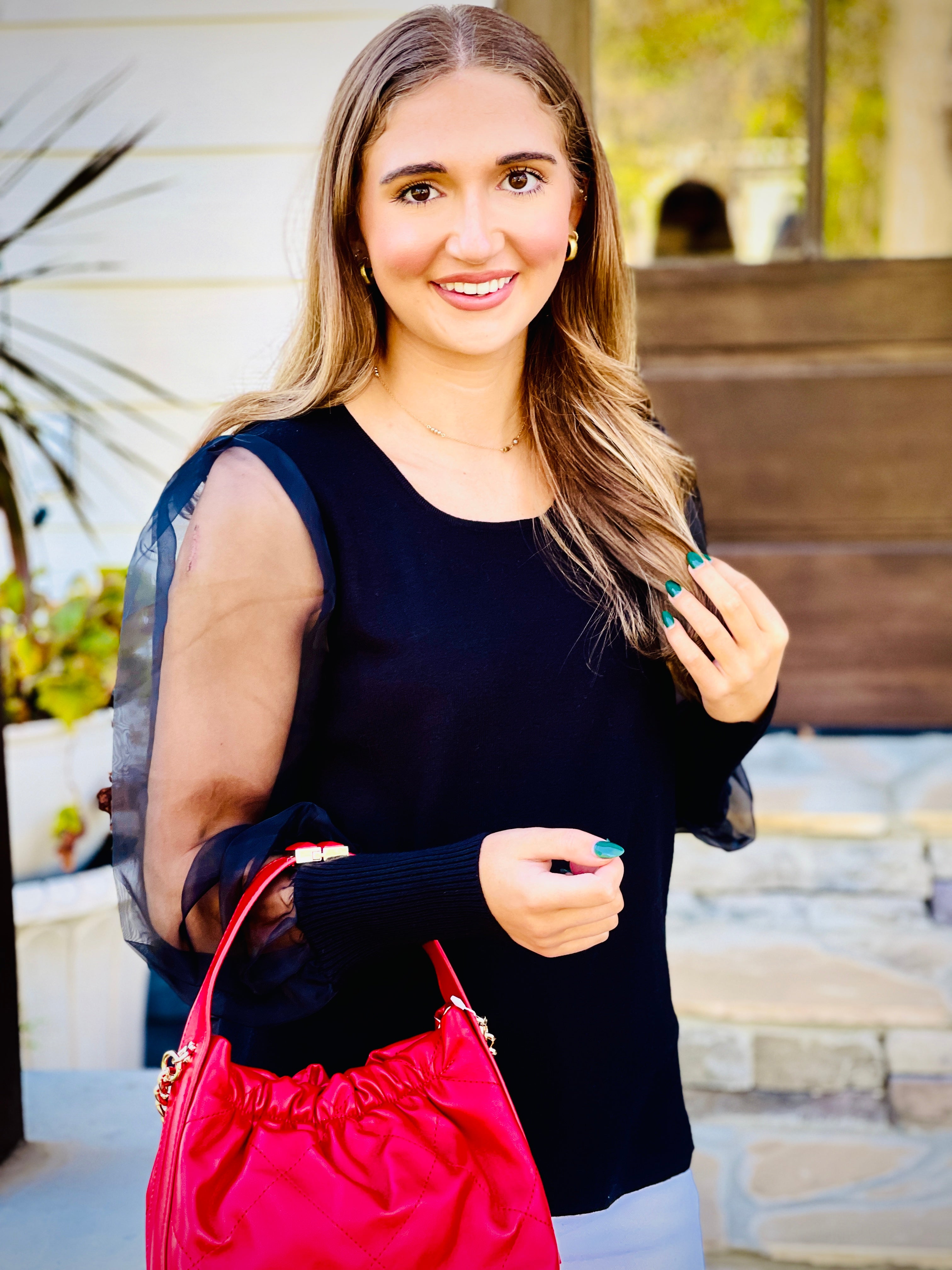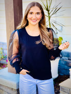 This top is expertly crafted from a mix of fabrics, with a U-neck design and mesh long puffed sleeves. The ribbing hems add a touch of sophistication. Perfect for adding a stylish and unique touch to any outfit.