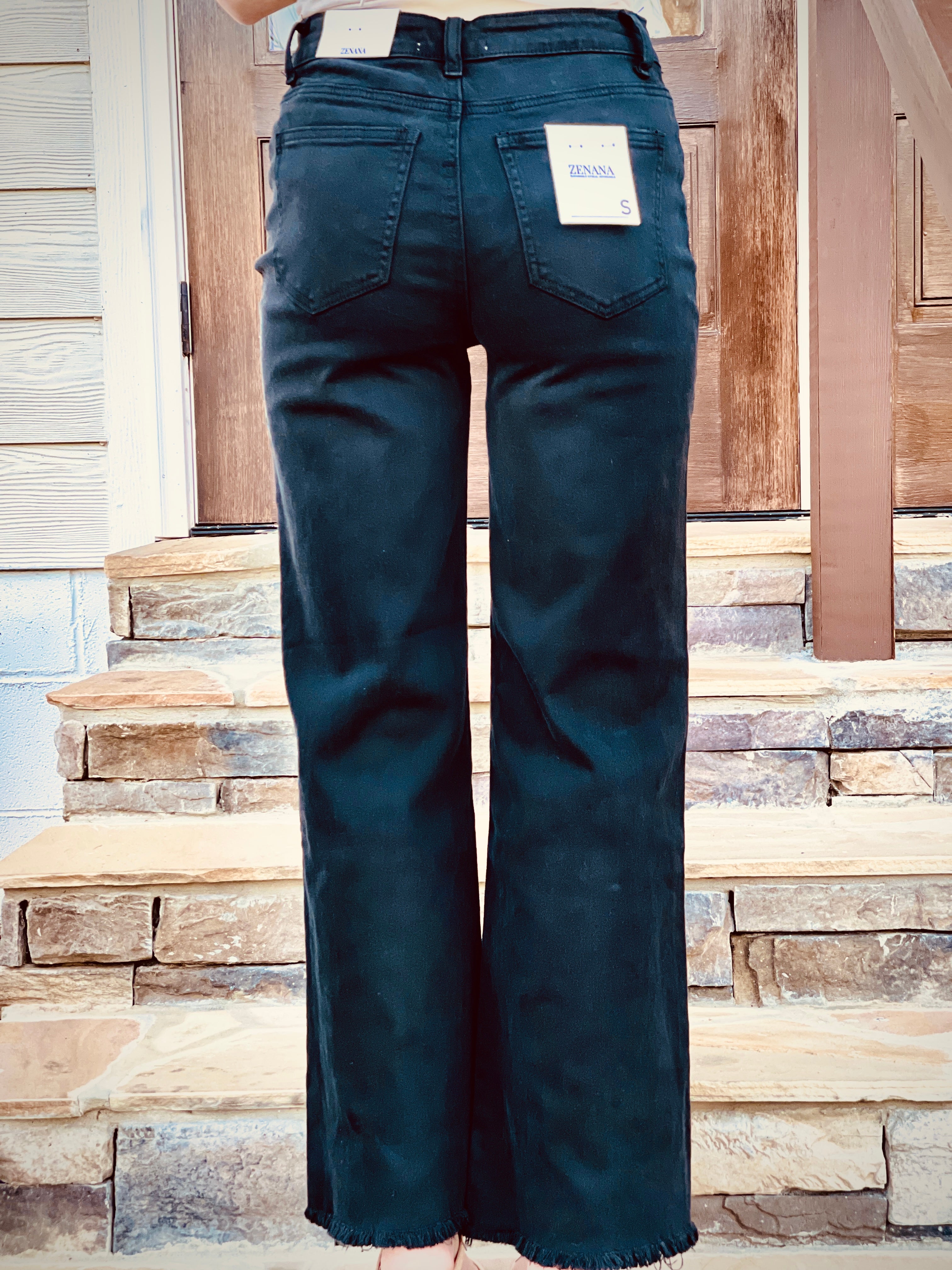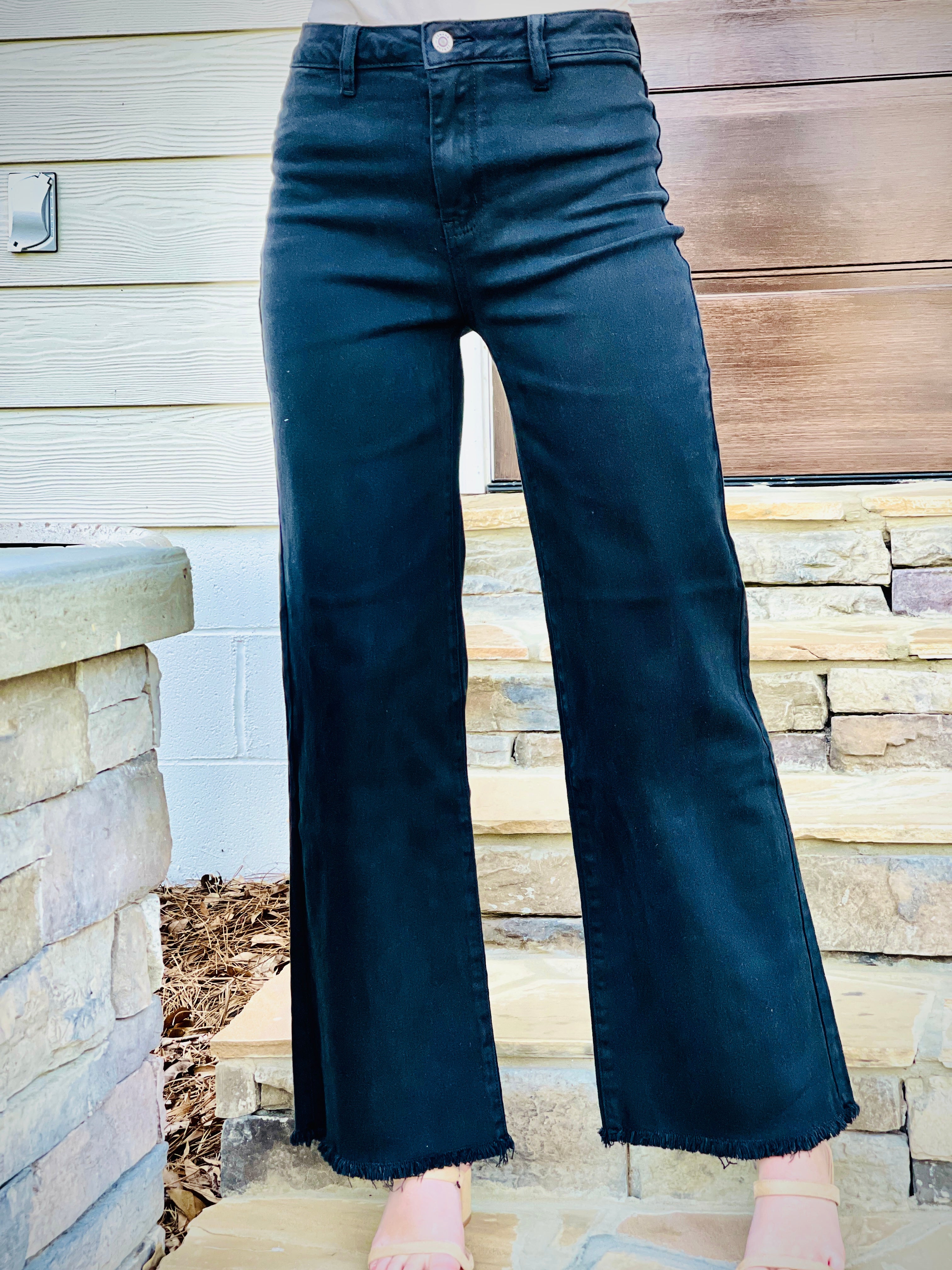 Acid Washed Frayed Cutoff Hem Straight Wide Pants- Black