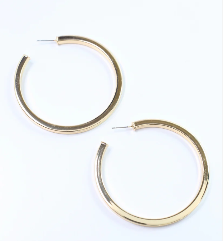 Hoop earrings never go out of style! This style has a shiny metal finish, and the size makes it a great subtle statement look.