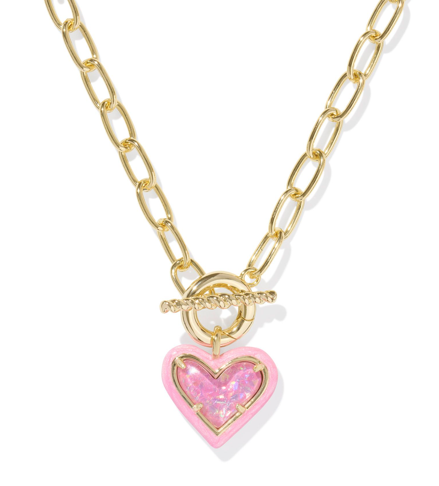 Fall in love all over again with Ari! The Ari Heart Gold Enamel Frame Link and Chain Necklace in Pink Iridescent Glitter Glass features our bestselling heart shape, surrounded by a color-coordinated enamel frame and set on a trendy link chain with a toggle closure. It's convertible, too: wear the heart charm for a touch of romance or remove it for a chic all-metal moment.