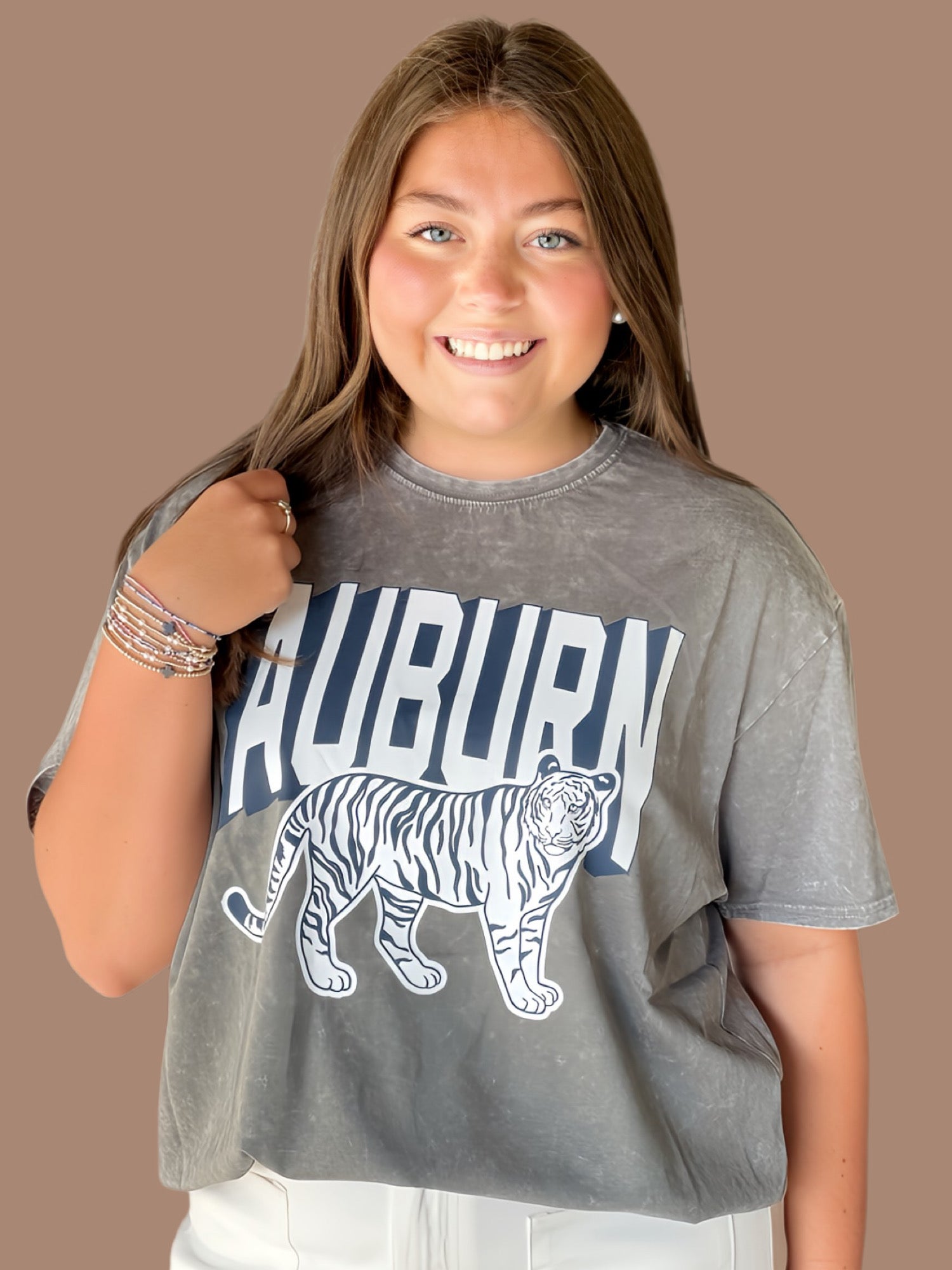 Cheer for the Auburn Tigers this year in this cute cause Wash graphic tee!