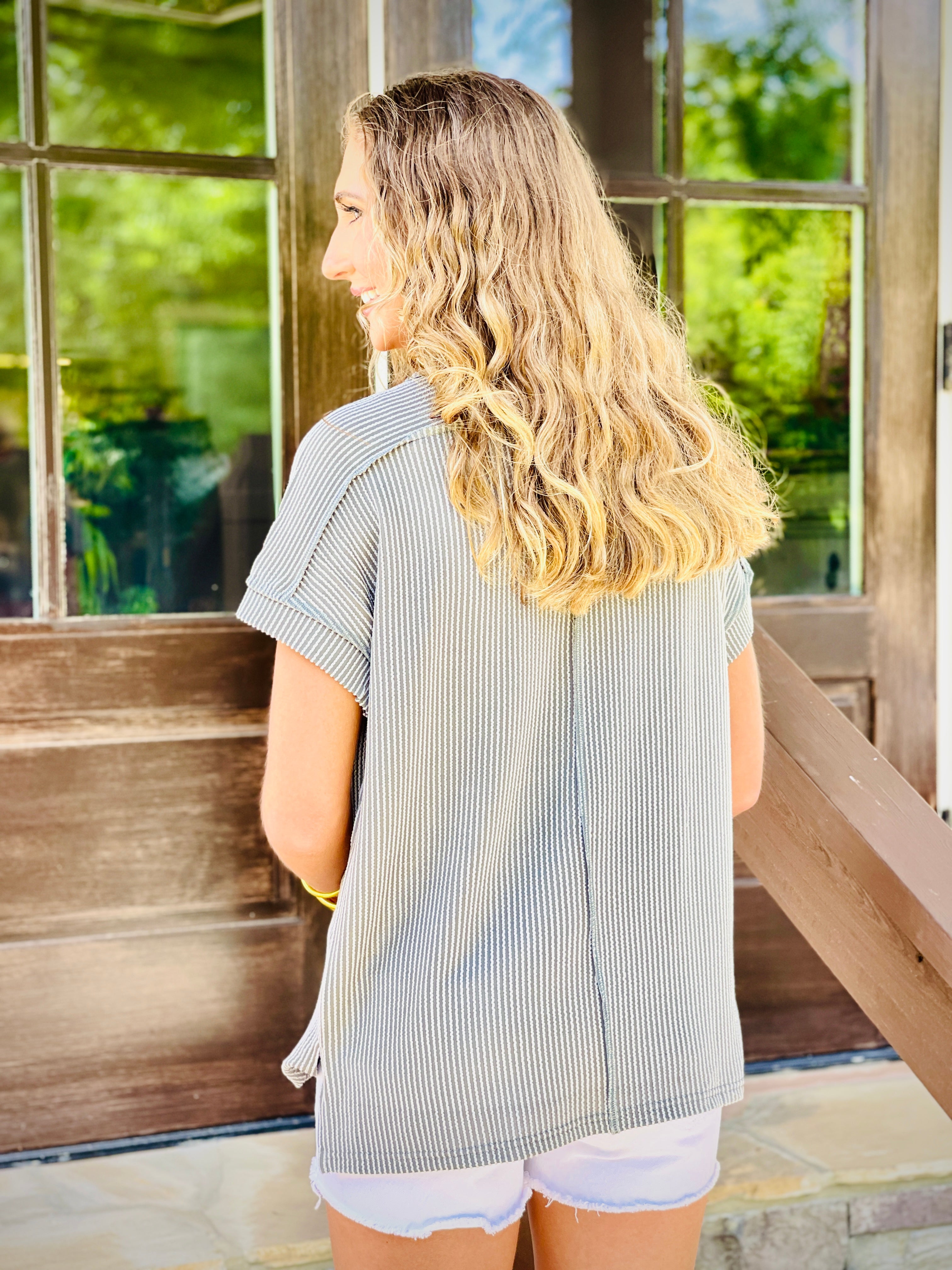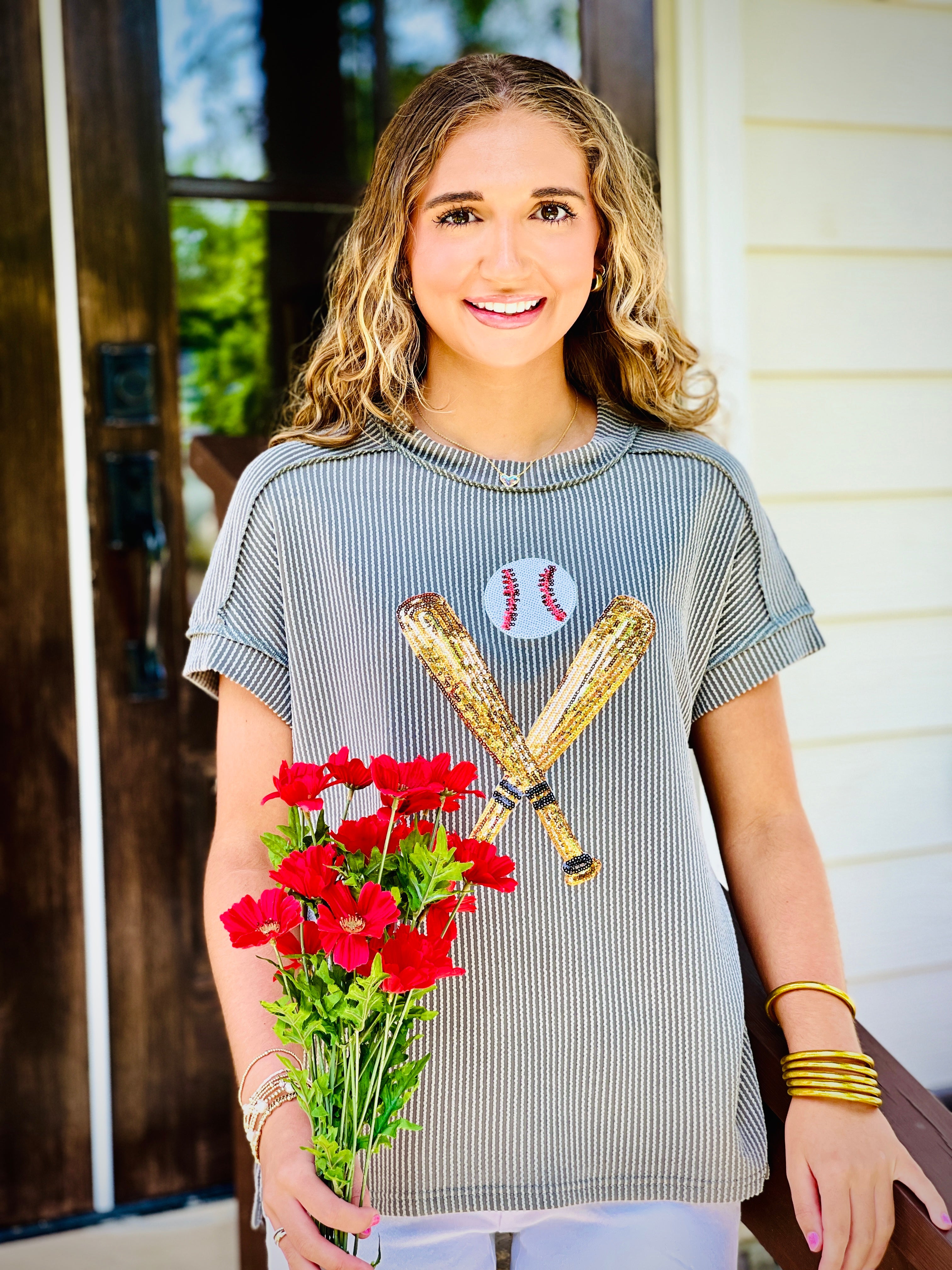 Effortlessly stylish, our ribbed knit T-shirt offers both comfort and sparkle. Perfect for daily wear or casual outings, the soft fabric and trendy sequin baseball graphic make it a unique addition to any wardrobe. The medium grey color allows for easy mix and match, making it suitable for any occasion.