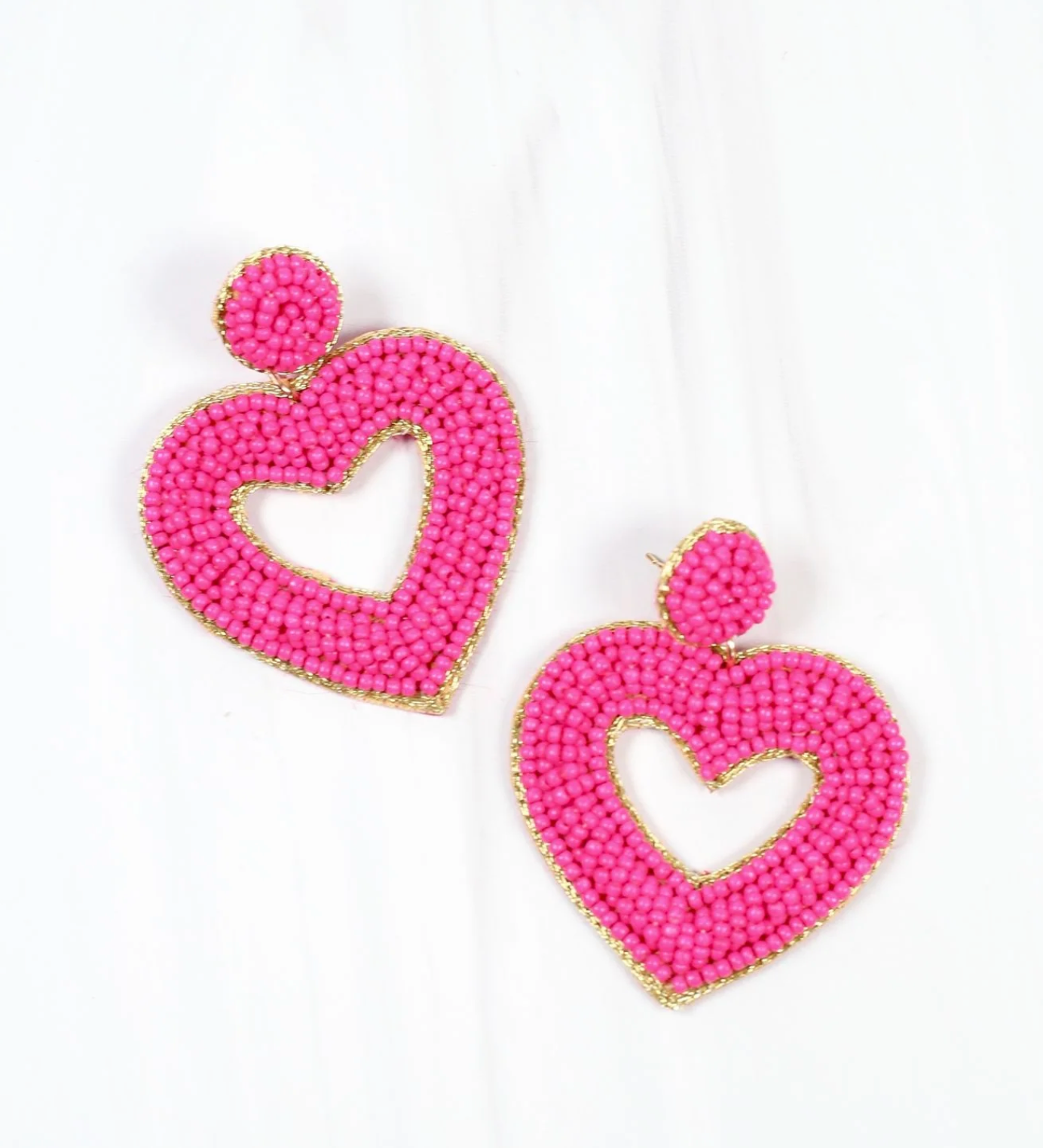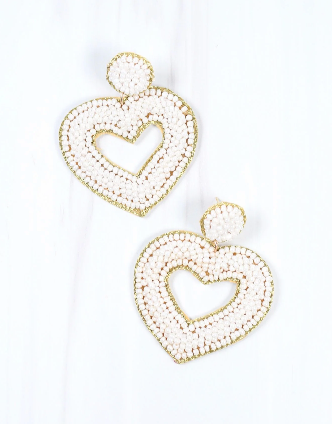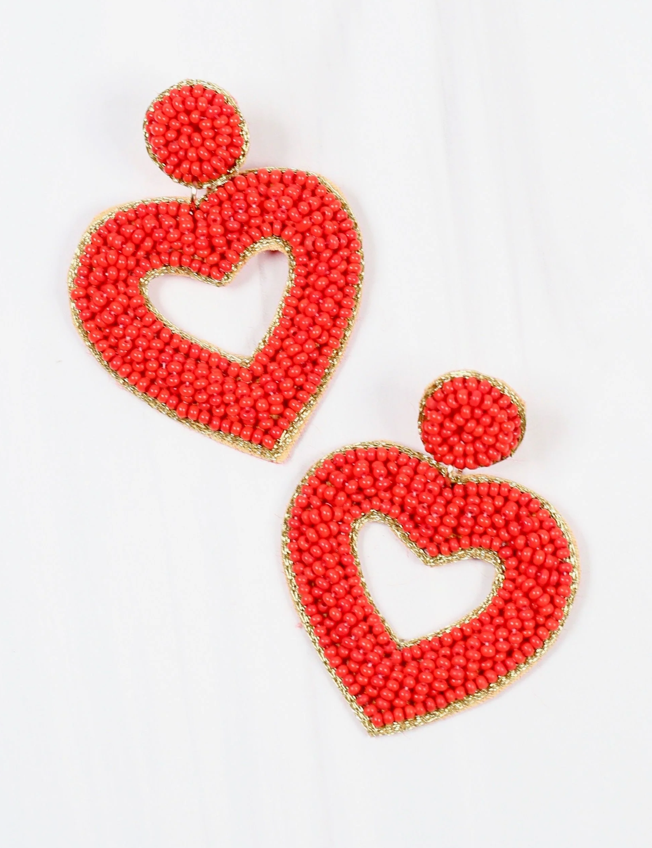 This open heart earring is beaded with a matching beaded post. It is also trimmed in gold threadwork and is felt covered on the back.