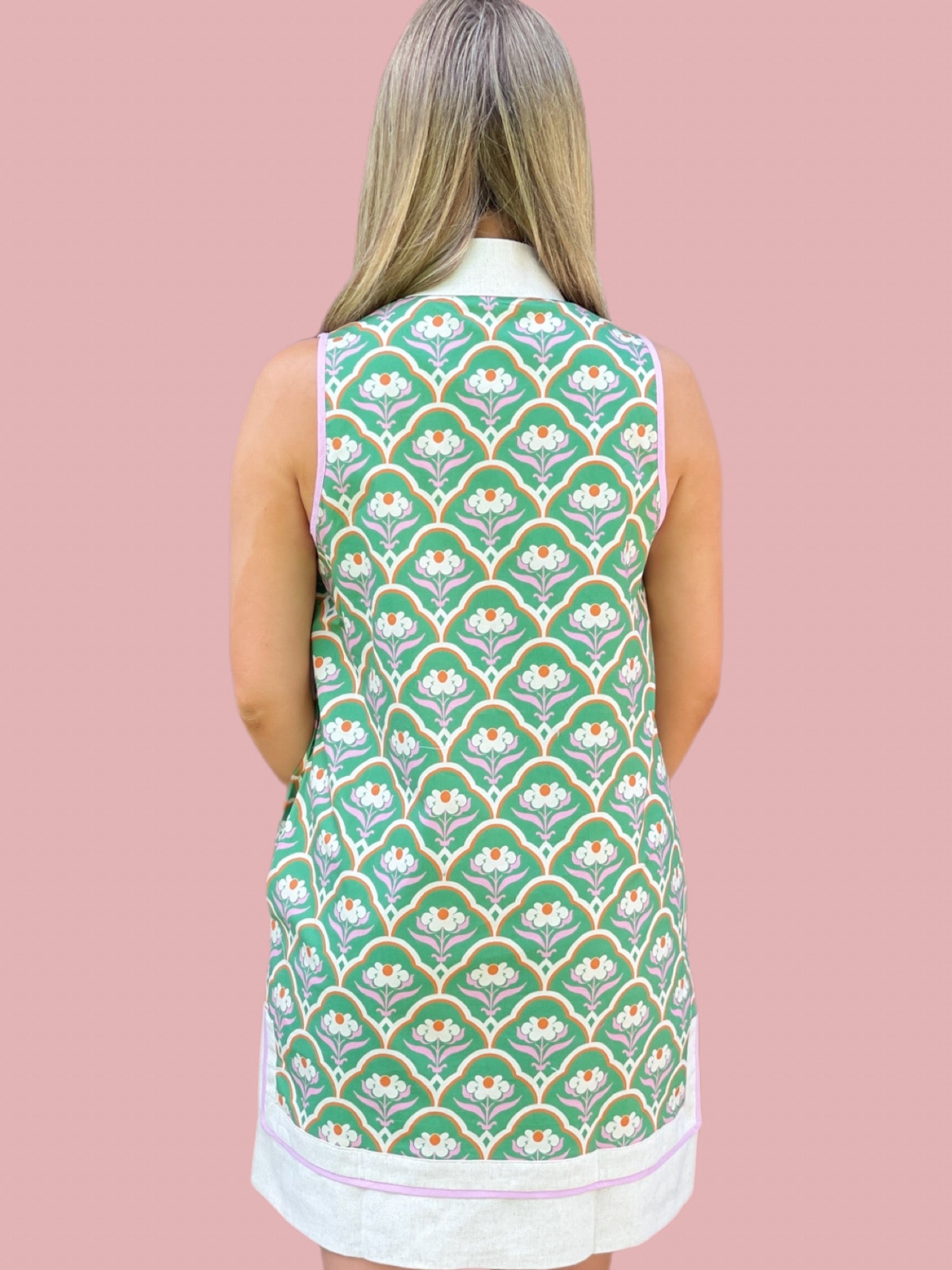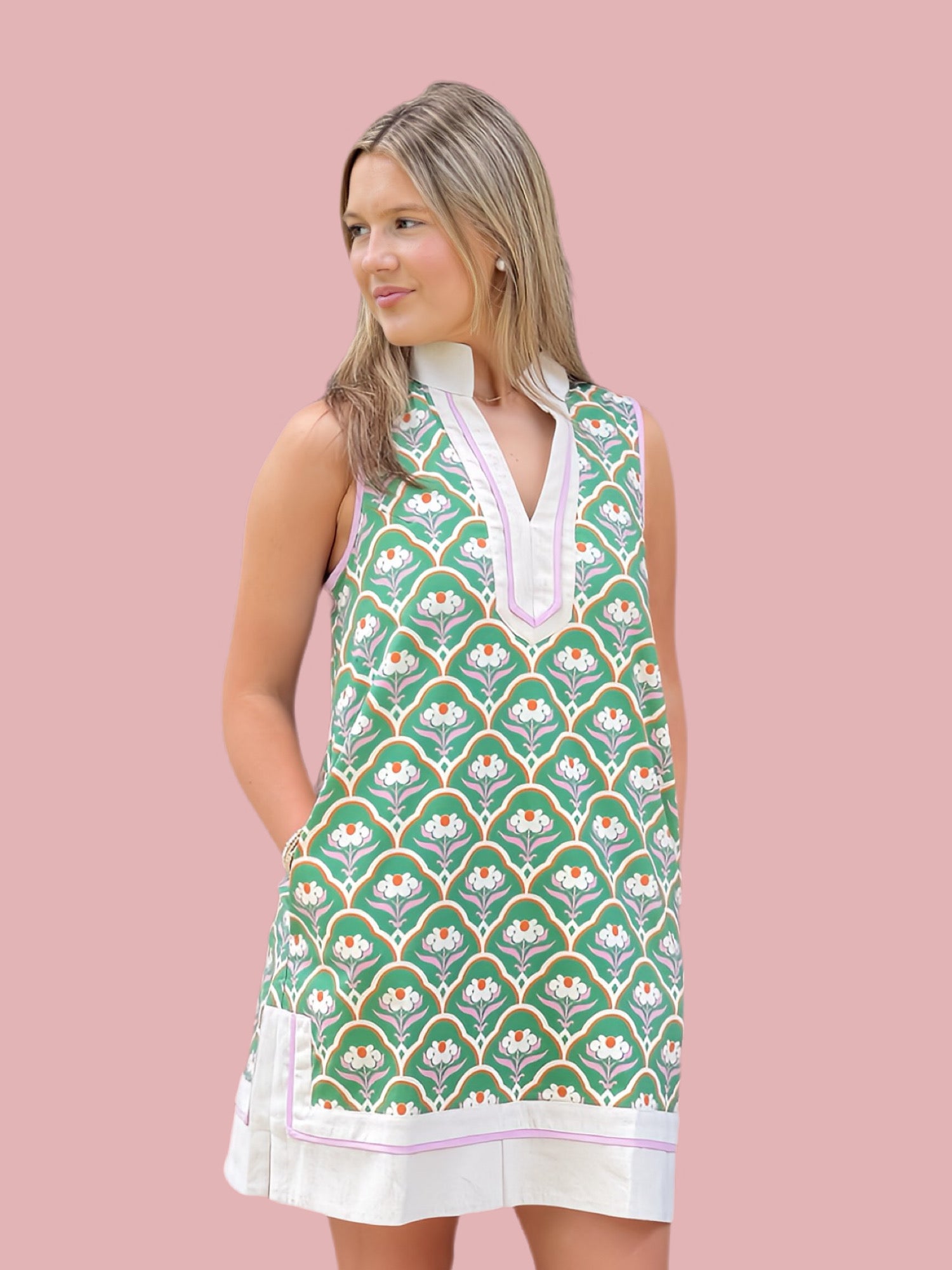 This sleeveless floral scallop motif mini dress features a caftan-inspired high neck, accented border details, and a subtle slit hem for easy movement.