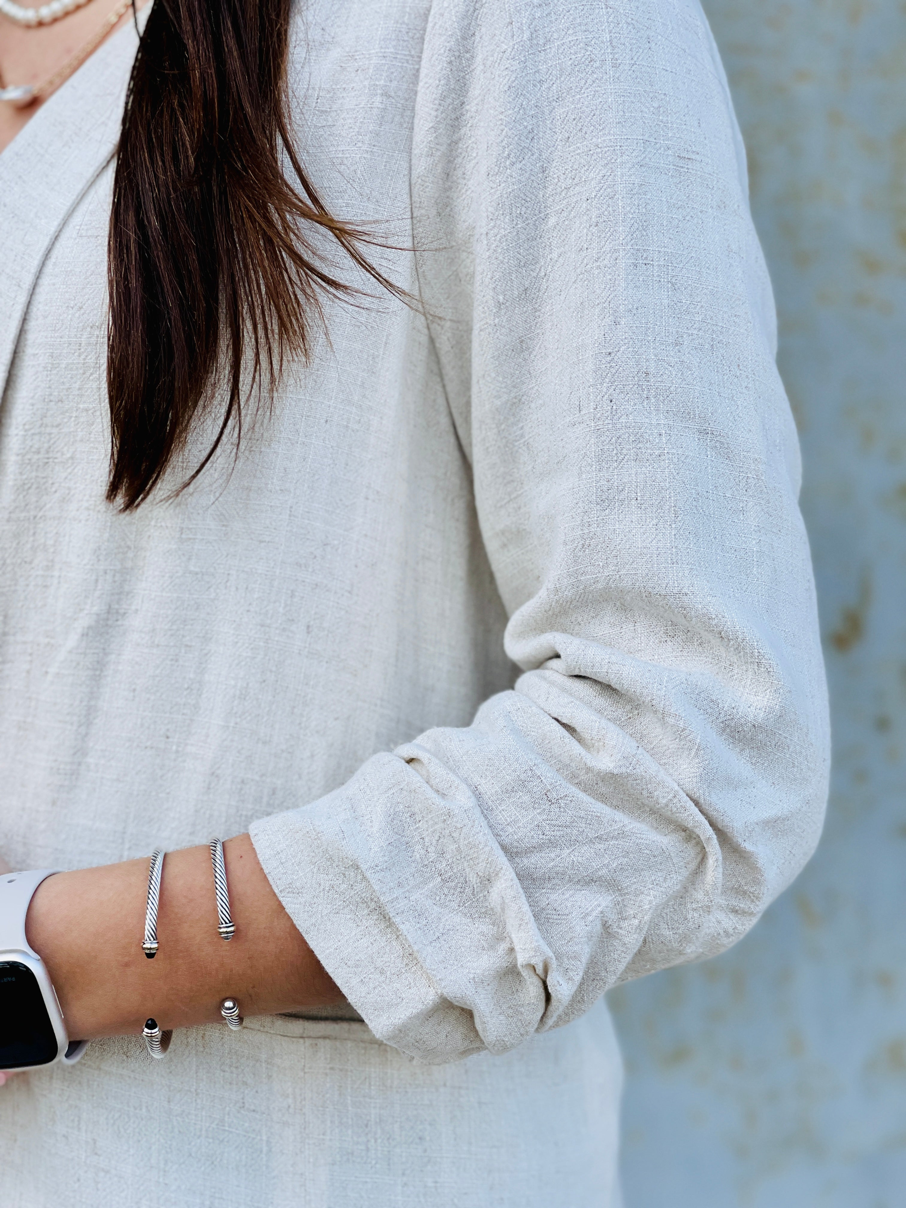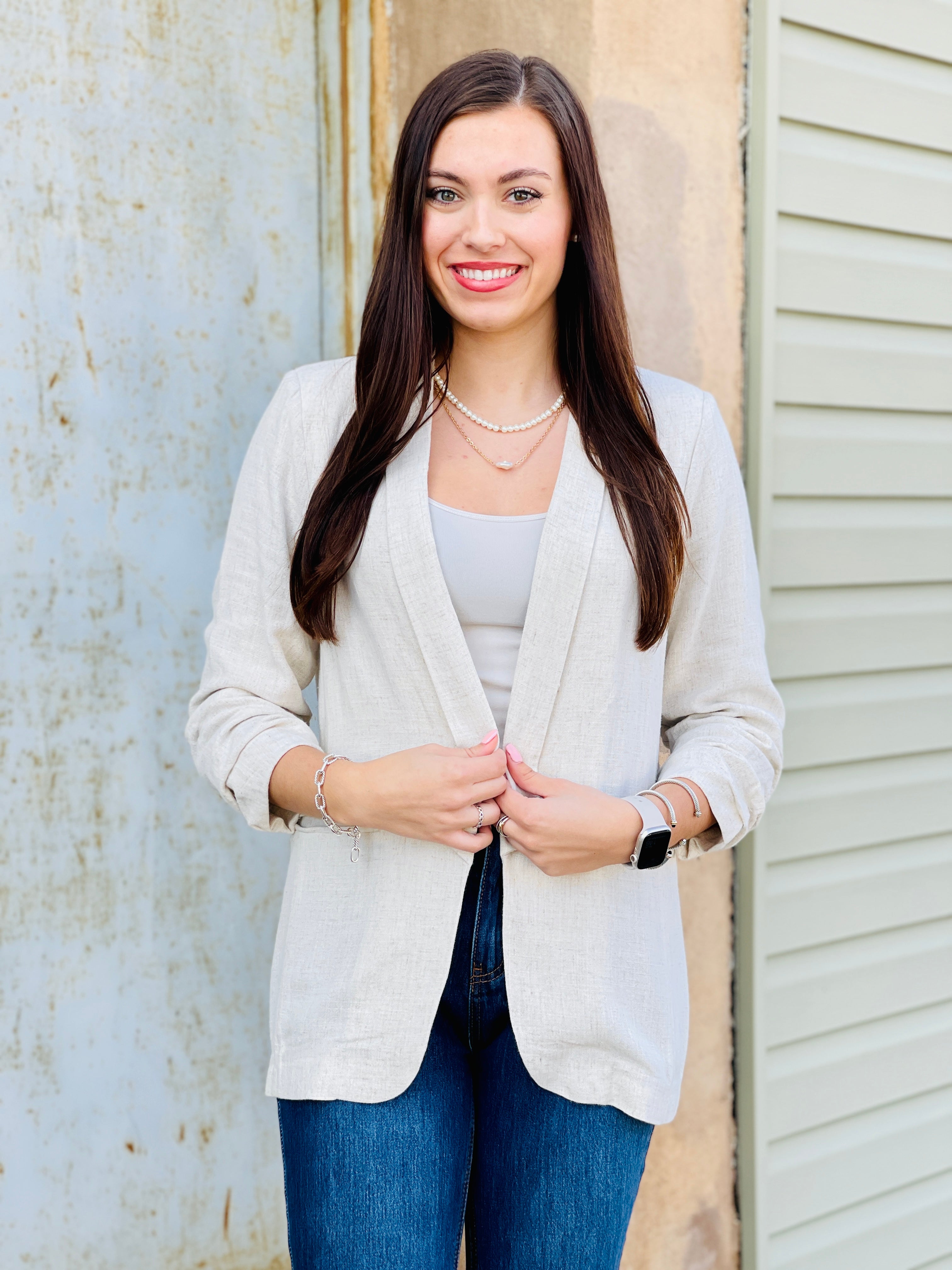 Description:::Solid blazer jacket featuring shirred detail at sleeve. Faux pocket at front. Non-sheer. Woven. Lightweight.