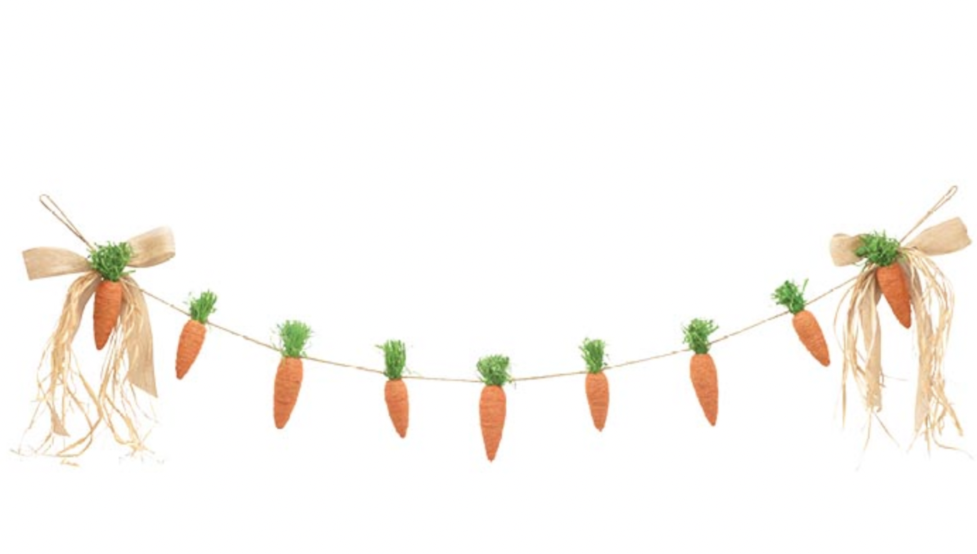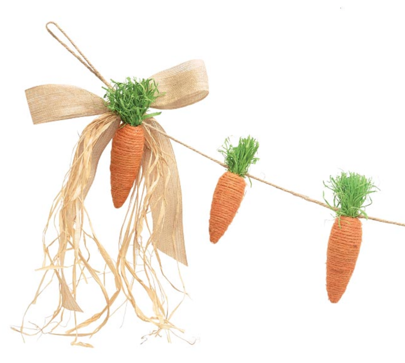 10 foam carrots hanging on a jute rope garland with green raffia bows and raffia tied at each end of the garland.