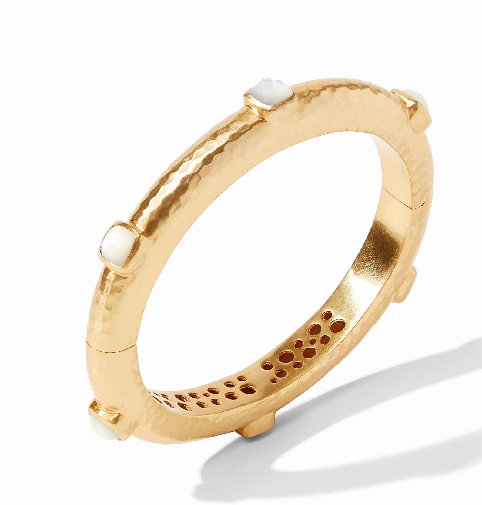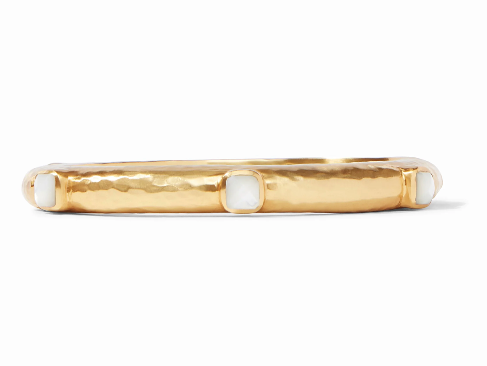 Lightly hammered bangle showcasing six stations of rose-cut imported glass with mother of pearl doublet.