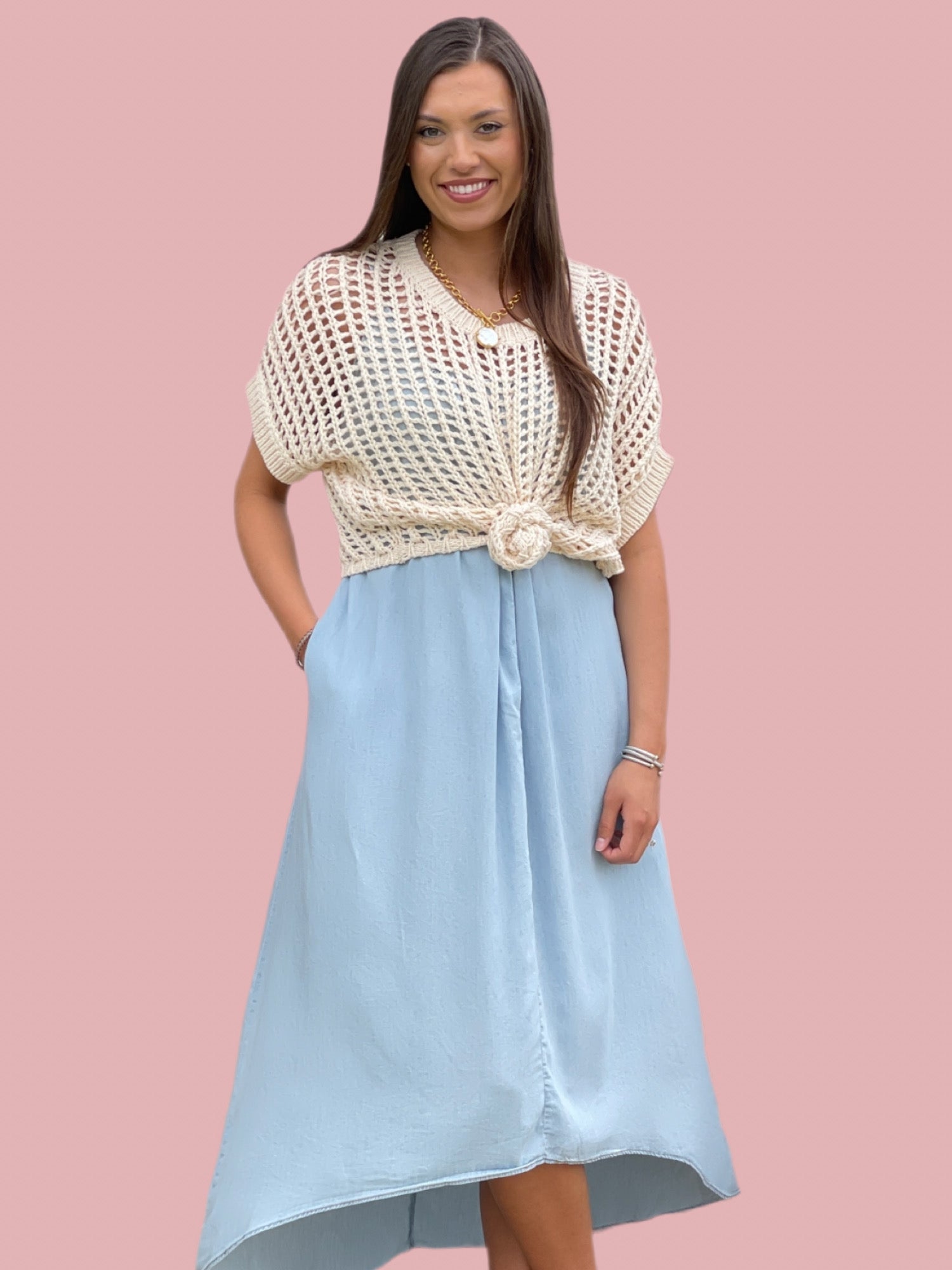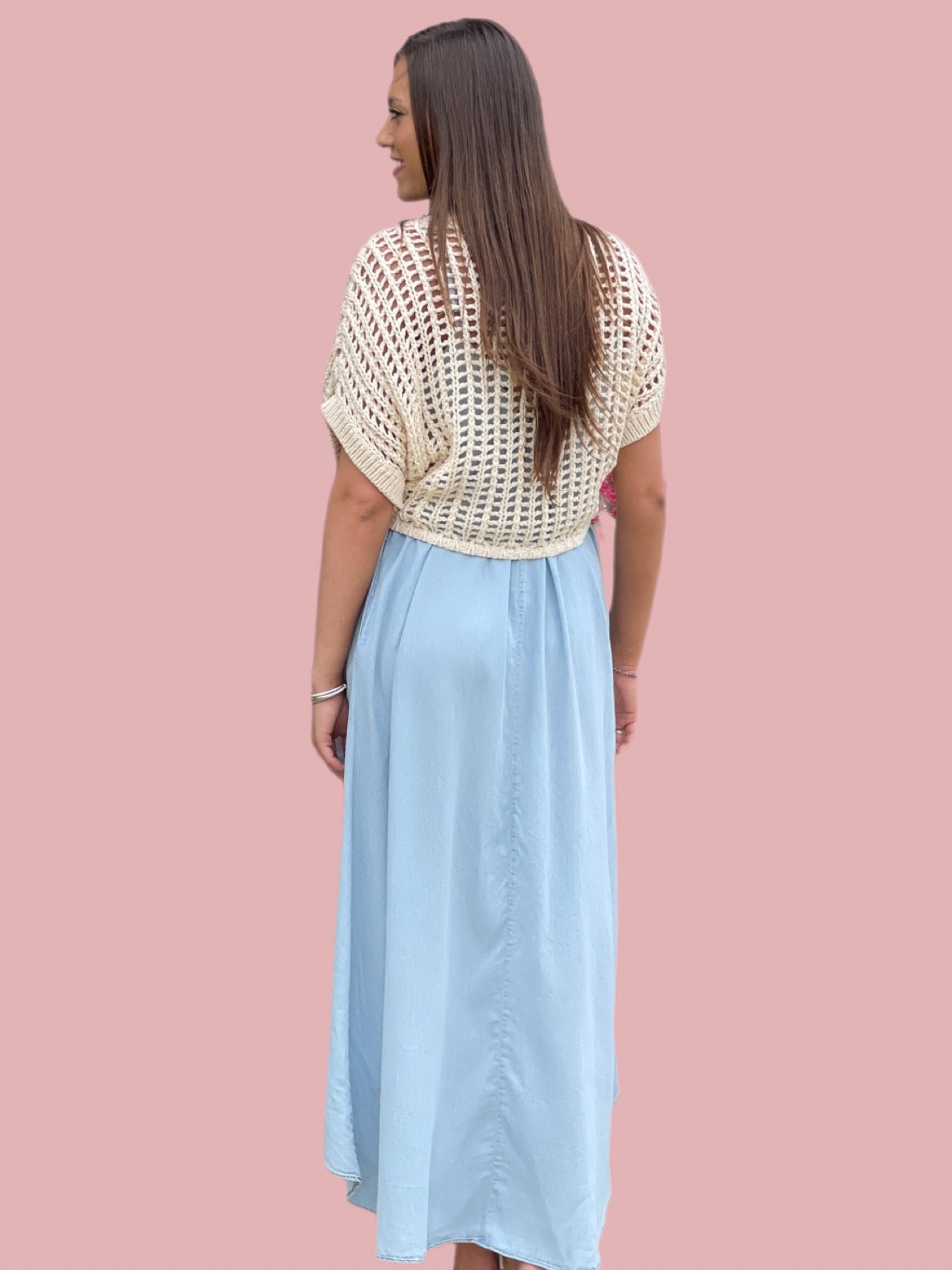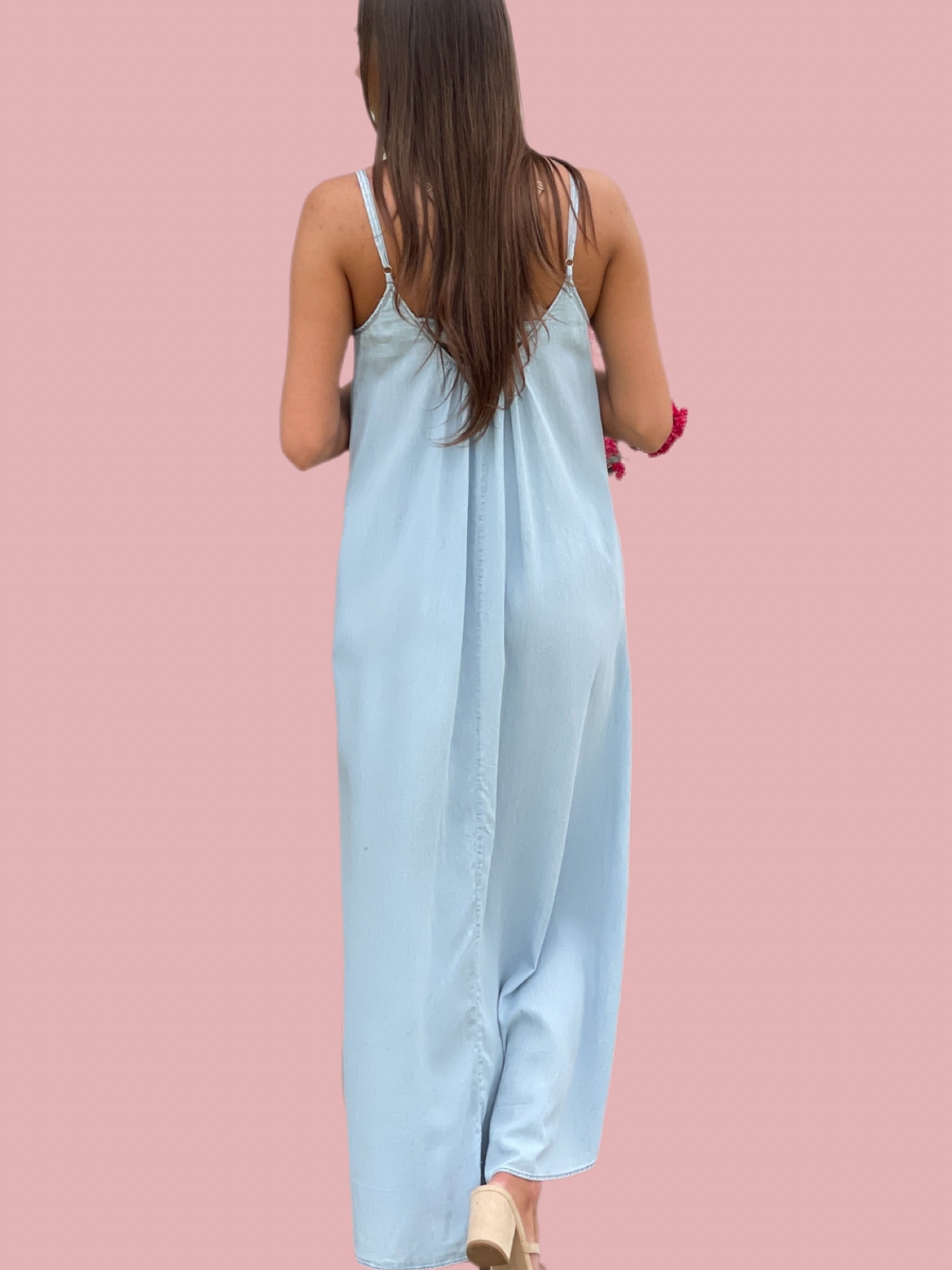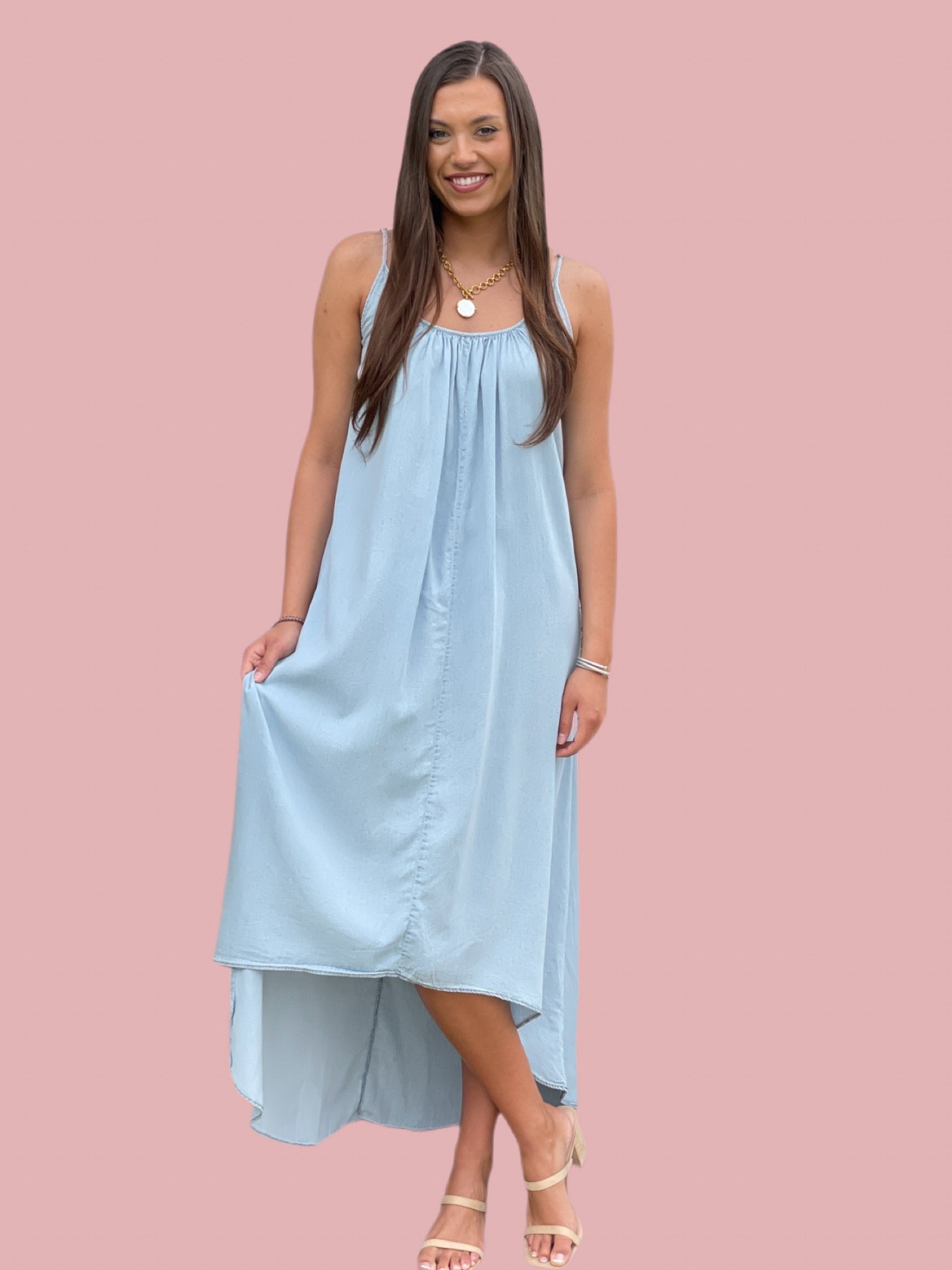 Effortlessly chic and laid back, this sleeveless chambray high-low dress is perfect for warm weather styling. With delicate adjustable spaghetti straps, a gathered scoop neckline, and an open back cutout detail, this maxi dress offers a relaxed fit and flowy silhouette. Lightweight and breezy, this dress is a must-have for any summer wardrobe.