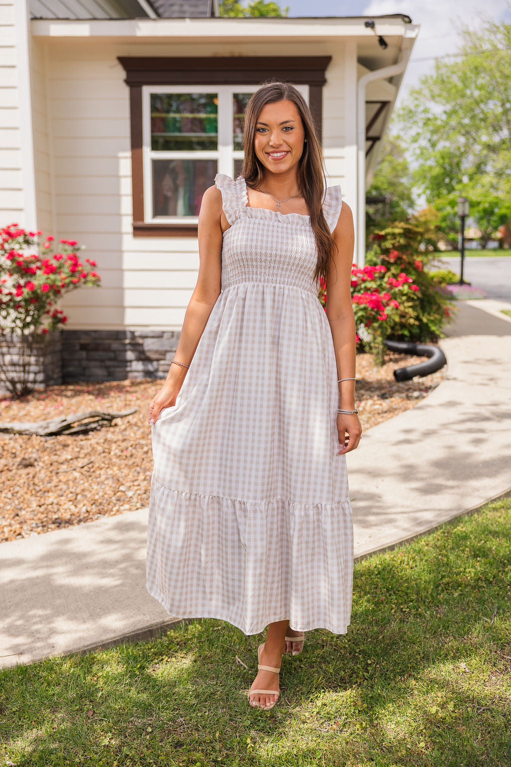 Elevate your style with our Checkered Ruffle Square Neck Maxi Dress. The high waist and A-line skirt accentuate your figure, while the ruched bust adds a touch of elegance. Made with soft and breathable fabric, it's perfect for any occasion. Expertly designed for fashion and comfort.