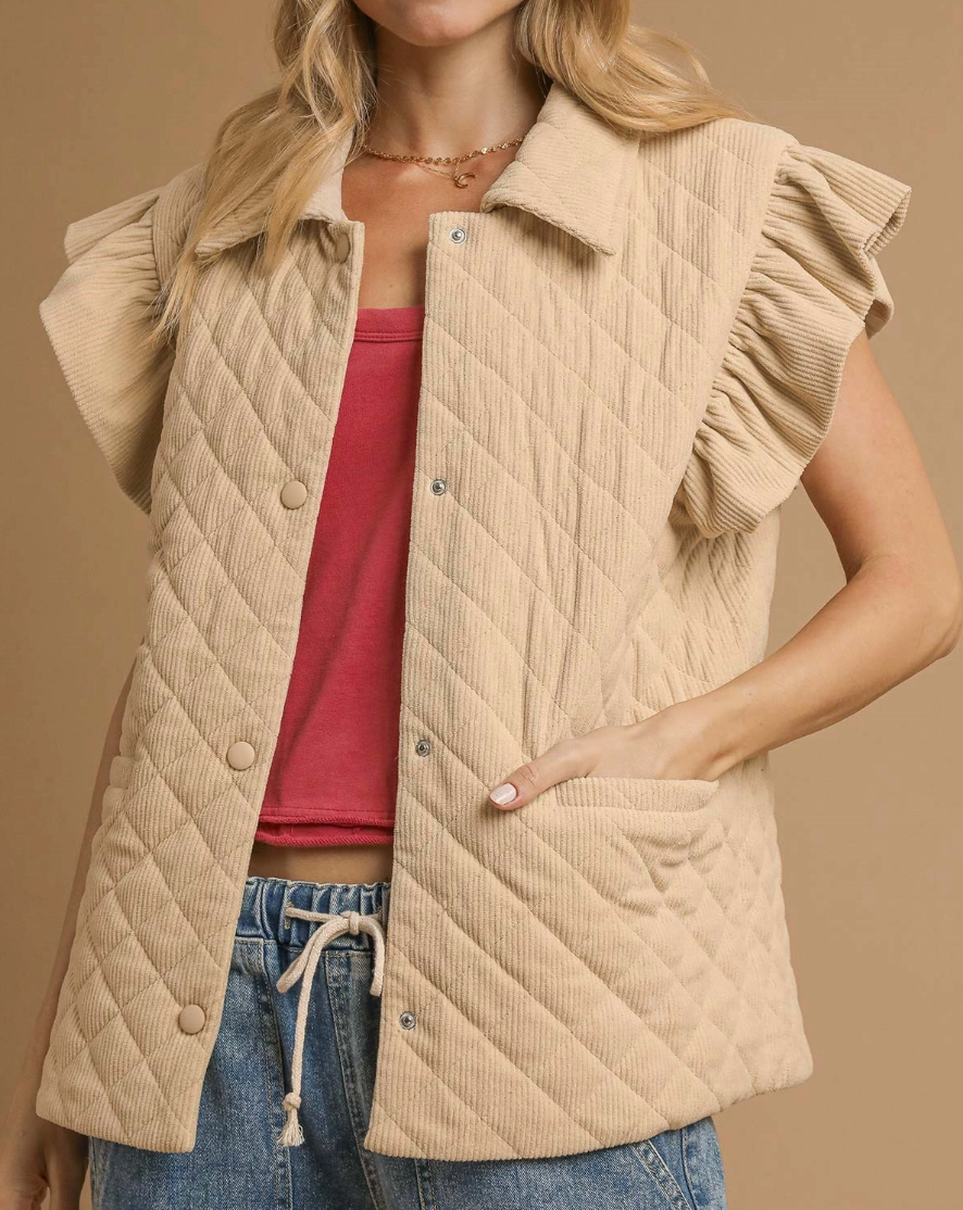Elevate your layering game with this sophisticated corduroy quilted vest, featuring distinctive ruffle sleeves that add dimension and movement to any ensemble. The quilted construction provides lightweight warmth without bulk, while the textured corduroy fabric delivers timeless appeal and durability. Perfect for transitional seasons, this versatile piece pairs effortlessly over tees, blouses, or sweaters for polished, intentional styling. The ruffle detailing at the sleeves introduces a refined touch of personality, making it an essential addition to a well-curated wardrobe.