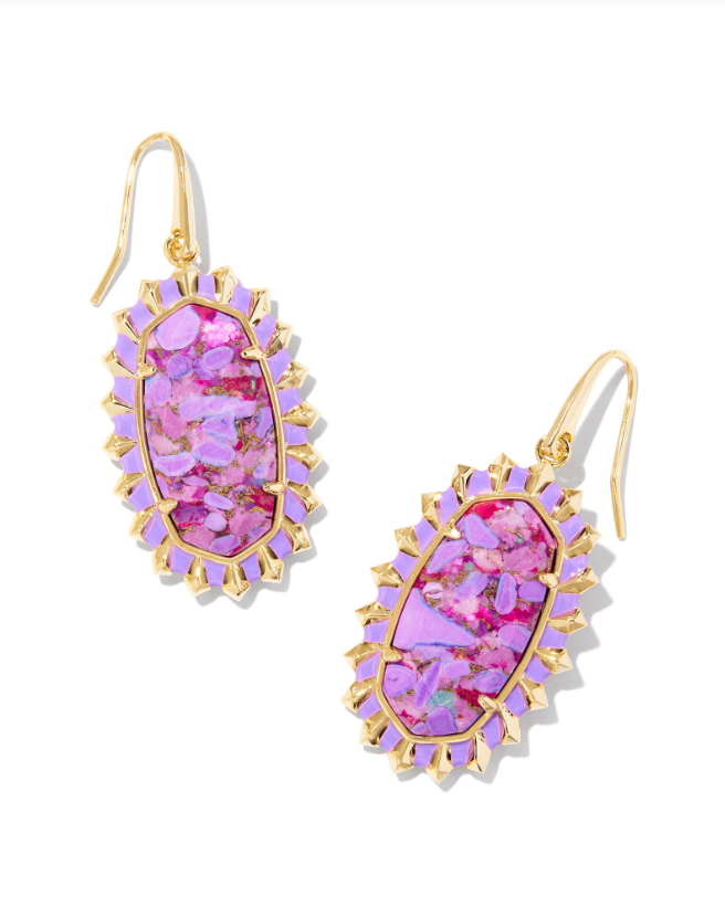 The Dani Gold Color Burst Frame Drop Earrings in Bronze Veined Violet Magnesite combine our love of color, shape, and innovative design. We’ve taken our signature stone shape and gave it a radiant refresh with a sunburst frame, made with an eye-catching blend of metal and enamel. These drop earrings also feature a sunburst design on the back, adding interest to your look from every angle.