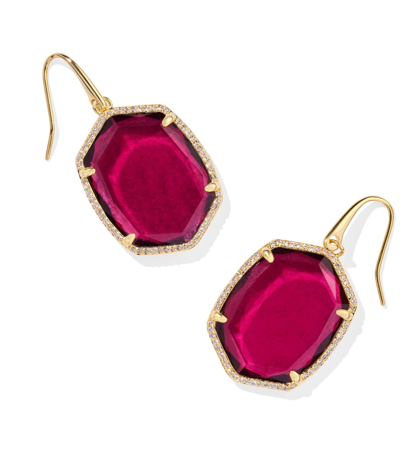 Your favorite drop earrings just got more glam. Featuring one of our signature stone shapes encased in a crystal-studded frame, the Daphne Gold Pave Frame Drop Earrings in Berry Mica will make a major statement with every wear.