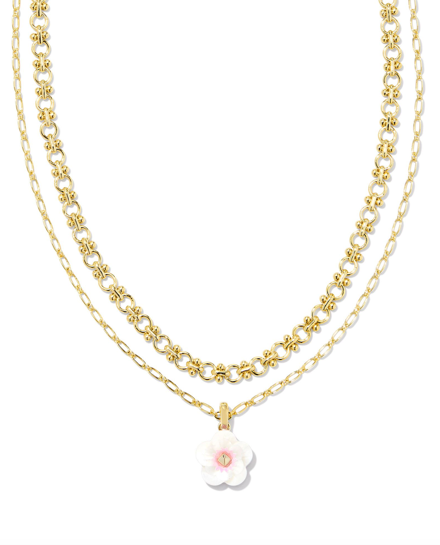 Deliah Gold Multi Strand Necklace in Iridescent Pink White Mix