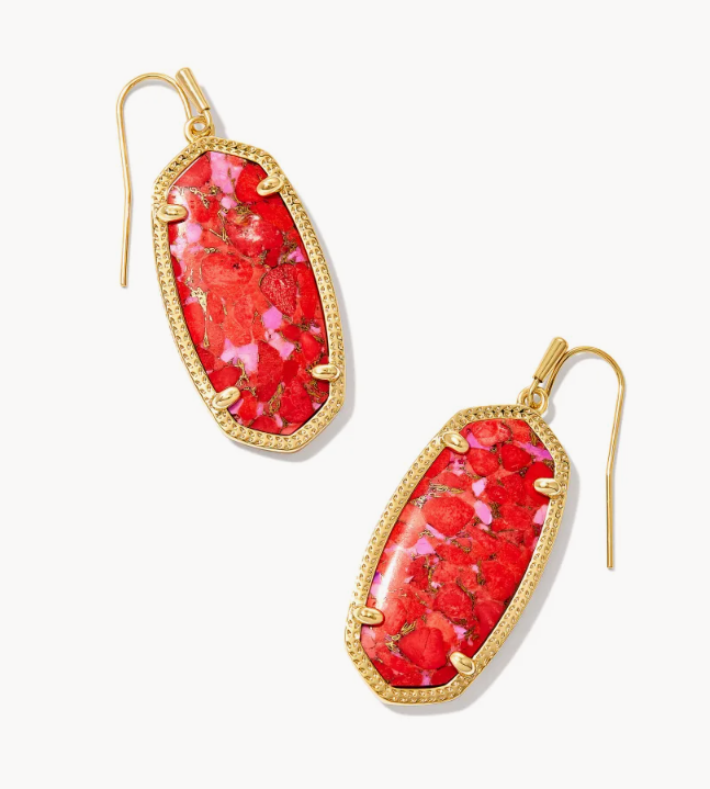 A best-selling icon designed after our signature statement shape, the Elle Gold Drop Earrings in Bronze Veined Red and Fuchsia Magnesite are inlaid with a genuine custom-cut stone. Scaled for daily wear and surprisingly lightweight, these one-of-a-kind earrings are a true collection classic.