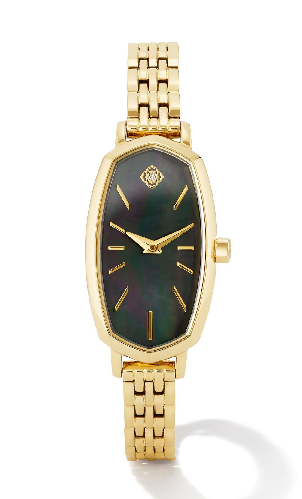 Elevate your style with the Kendra Scott Black Mother of Pearl Watch. Featuring a sleek gold finish and stunning black mother of pearl dial, this watch sets you apart from the crowd. Made with quality craftsmanship for a luxurious touch, it's the perfect accessory for any occasion.