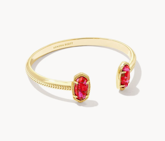 A dainty pinch cuff bookended with our signature oval stones, the Elton Gold Cuff Bracelet in Bronze Veined Red and Fuchsia Magnesite is a stack staple. This beautifully designed gold cuff bracelet is guaranteed to turn heads every time you wear it. No matter the size of your wrist, our Elton Cuff Bracelet is sure to fit you and your style.