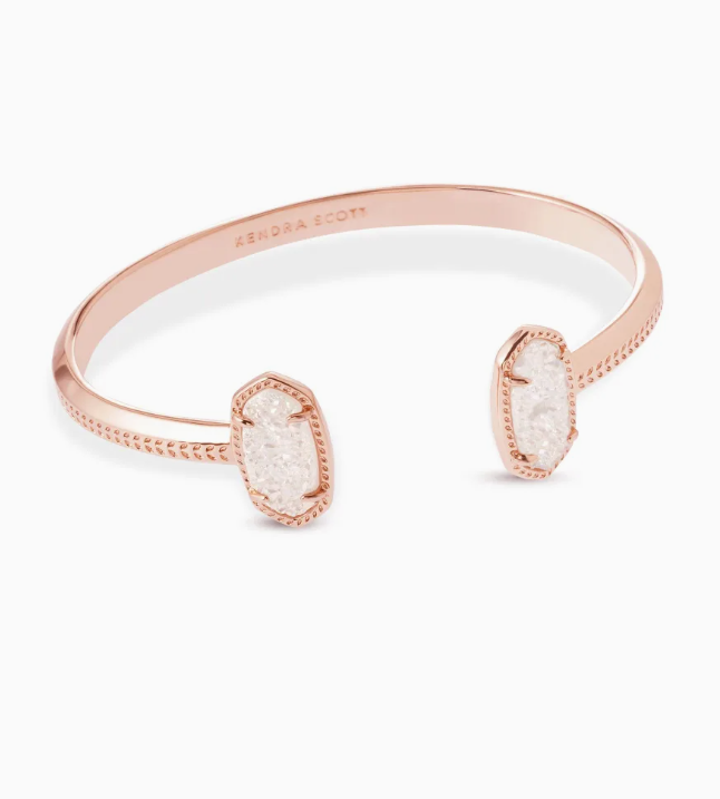 A dainty pinch cuff bookended with our signature oval stones, the Elton Rose Gold Cuff Bracelet in Iridescent Drusy is a stack staple. This beautifully designed rose gold cuff bracelet is guaranteed to turn heads every time you wear it. No matter the size of your wrist, our Elton Cuff Bracelet is sure to fit you and your style.
