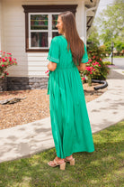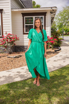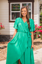 Expertly designed and crafted, this wrap style maxi dress features short flutter sleeves for a chic and effortless look. The waist tie cinches your figure and the chest snap button adds a secure fit. With delicate embroidery accents, this dress is a timeless addition to your wardrobe.