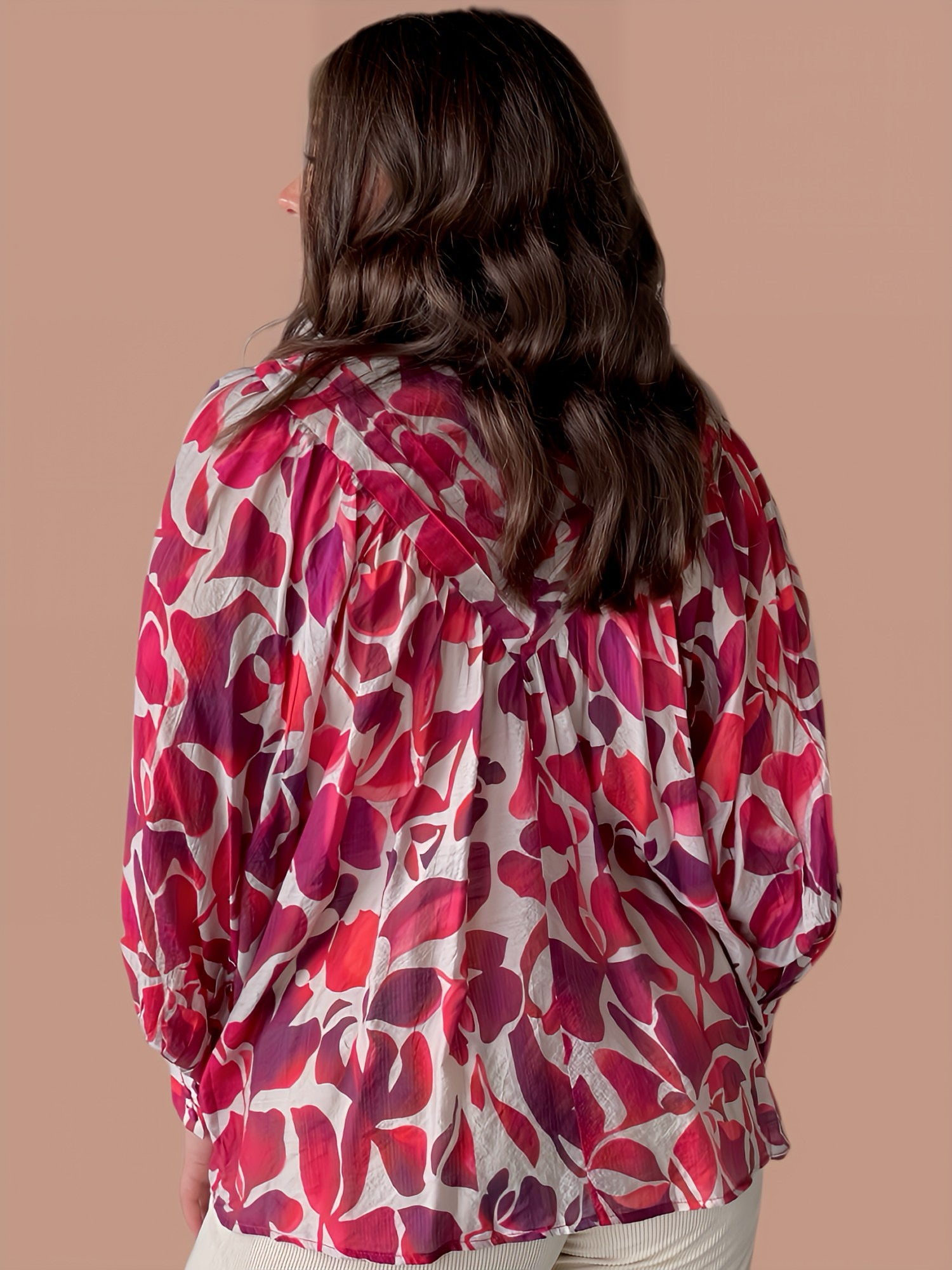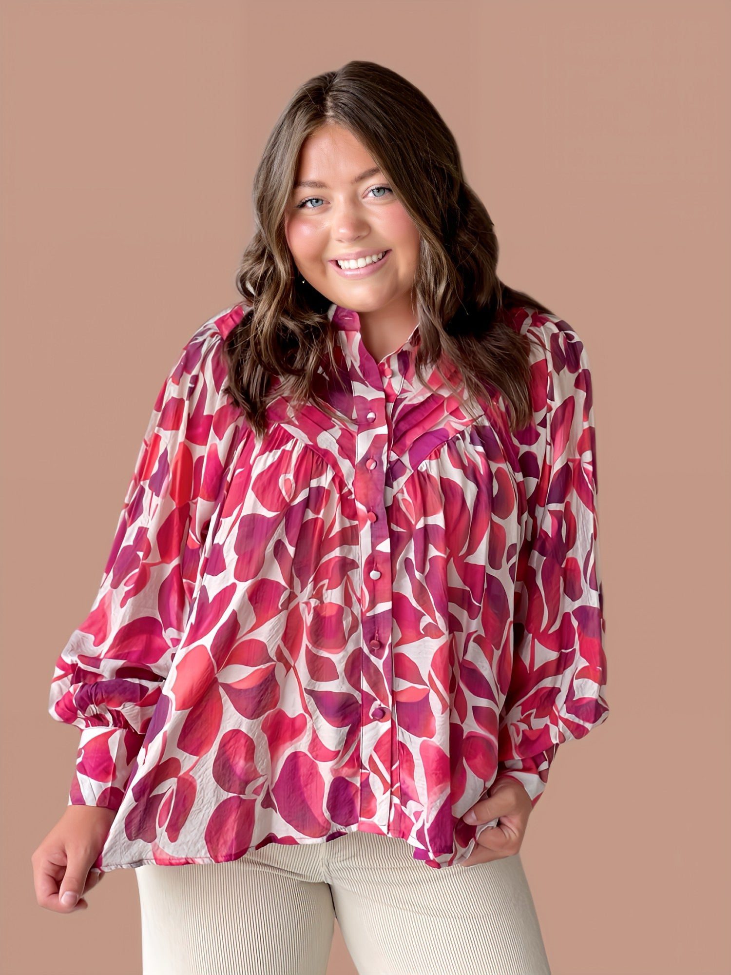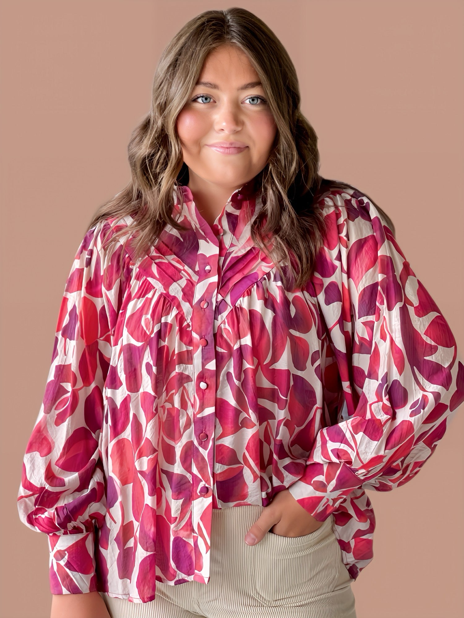 This blouse showcases an abstract leaf print paired with a pleated bib accented by covered buttons, delivering refined detail. Its voluminous balloon sleeves end in buttoned cuffs, enhancing the sophisticated silhouette. Designed with soft gathering, the relaxed fit offers a breezy, flowy movement that combines comfort with artistic elegance. Ideal for those seeking a statement piece with expert craftsmanship and subtle complexity.