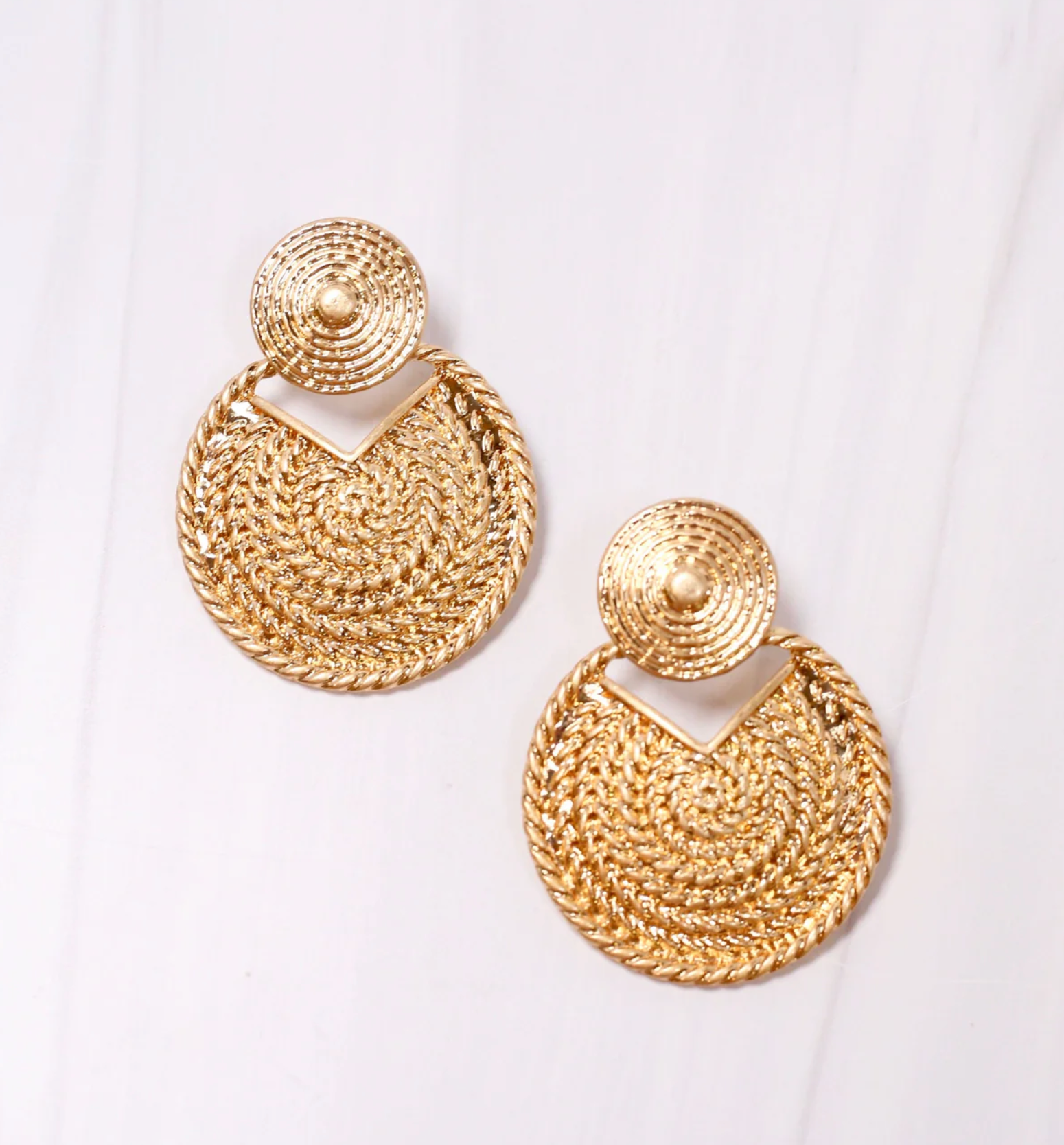 This metal drop earring features a circular designed post with a woven metal accent drop.