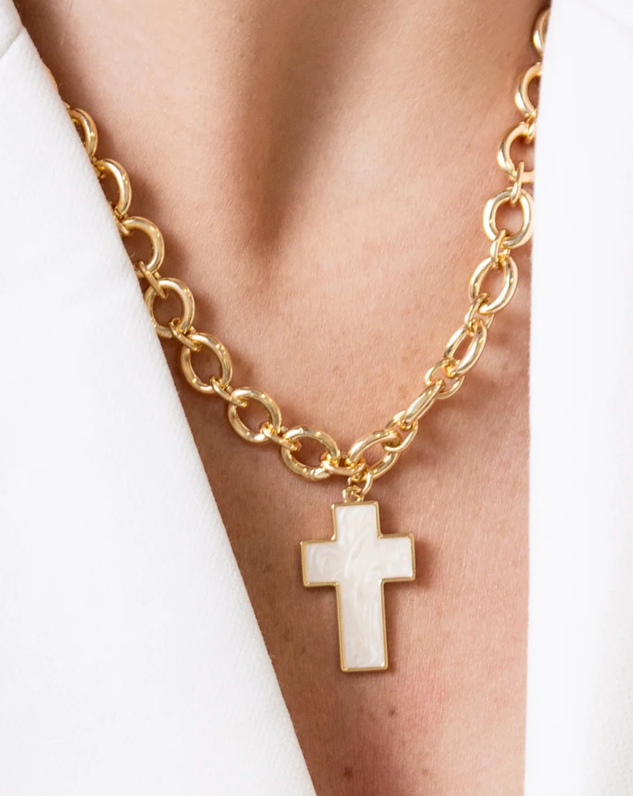 Our Hartford Necklace combines timeless charm with a bold, modern twist. Featuring a beautifully detailed cross pendant on a statement chain, this piece adds a touch of elegance and edge to any look. Perfect for wearing solo or layering with other favorites, the design makes it an eye-catching accessory that transitions effortlessly from casual to formal.