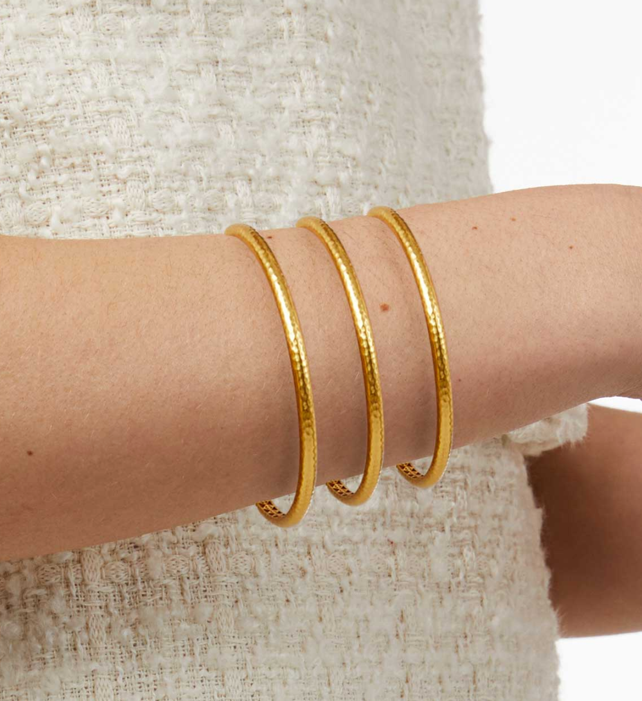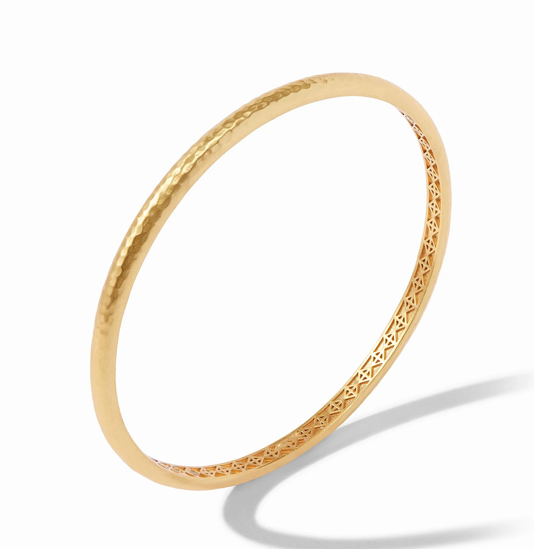 Elegant yet simple, this slim golden bangle features a lightly hand-hammered finish. An ornately geometric bas relief interior adds lightness and luxury for wearing stacked or solo.