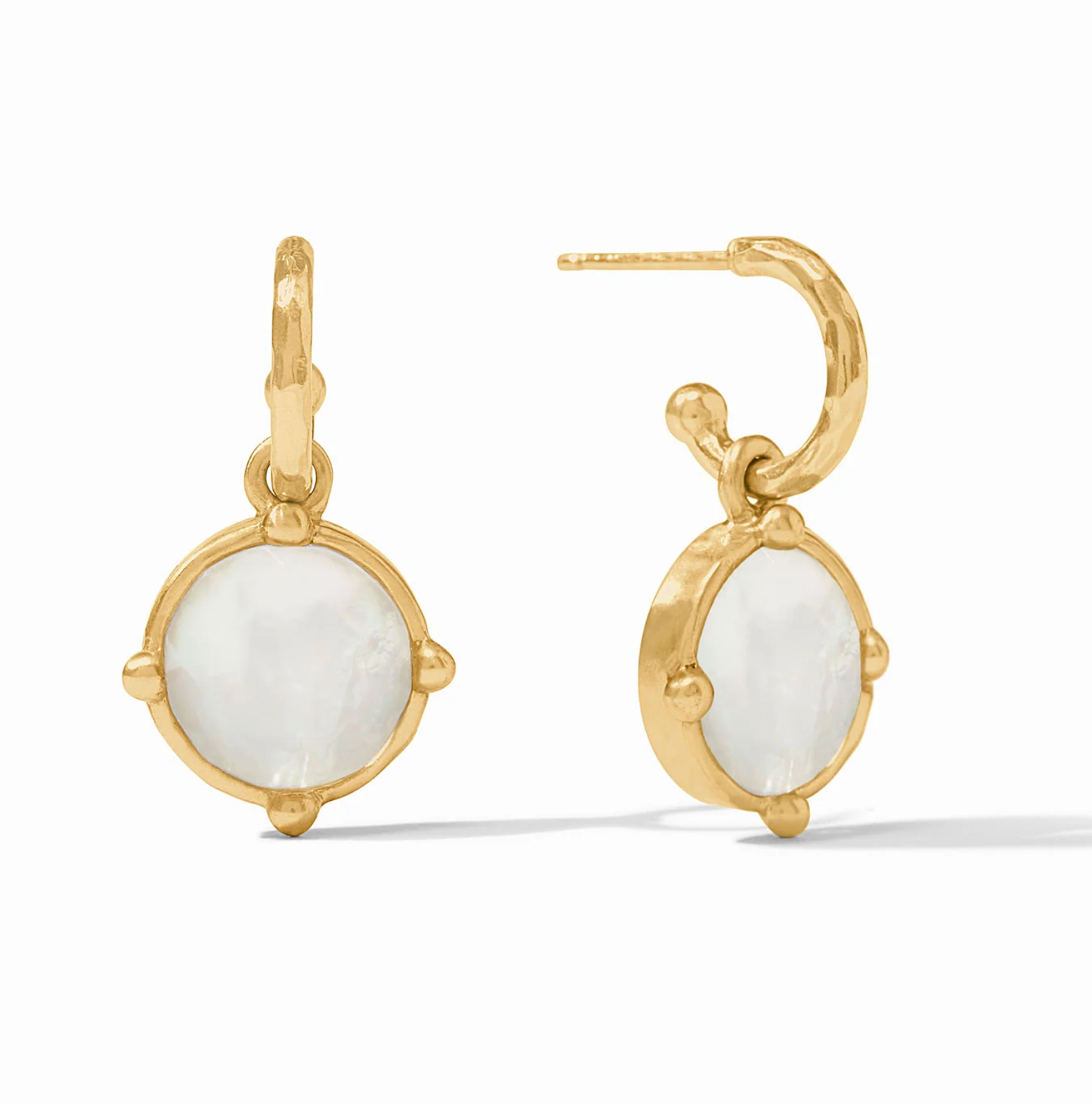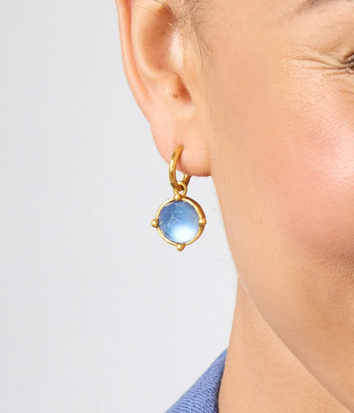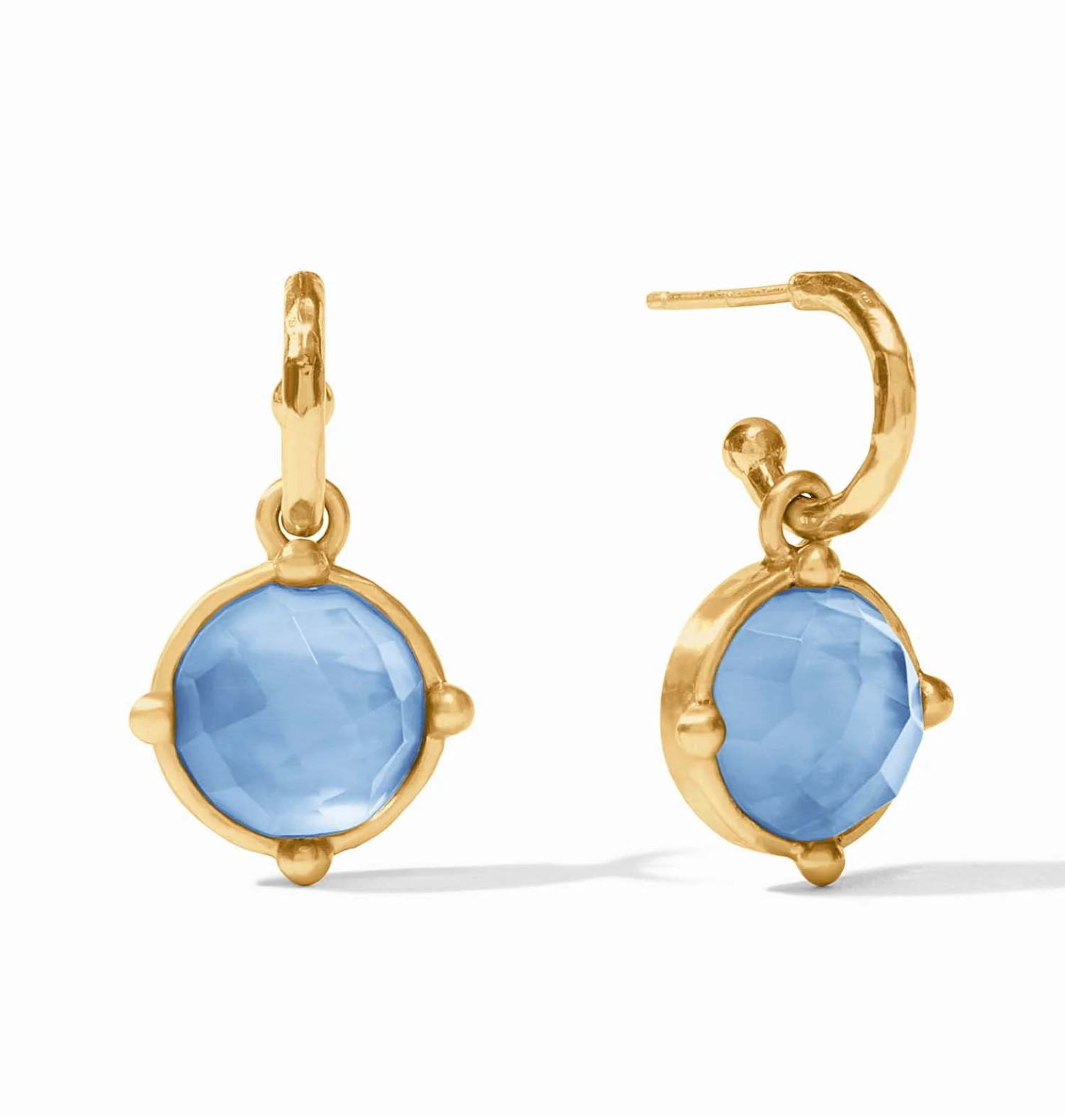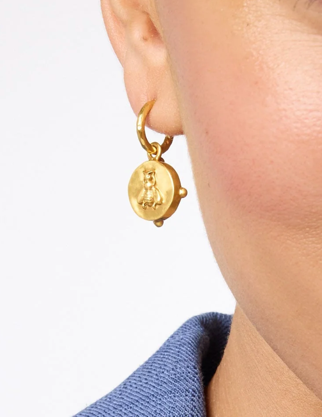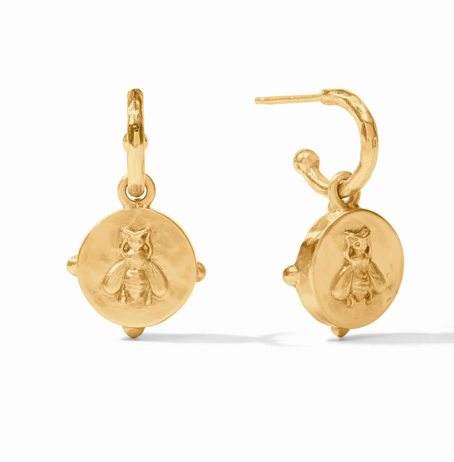 Each reversible charm features a faceted gemstone enhanced with golden beads on one side and a detailed bee cameo on the other.