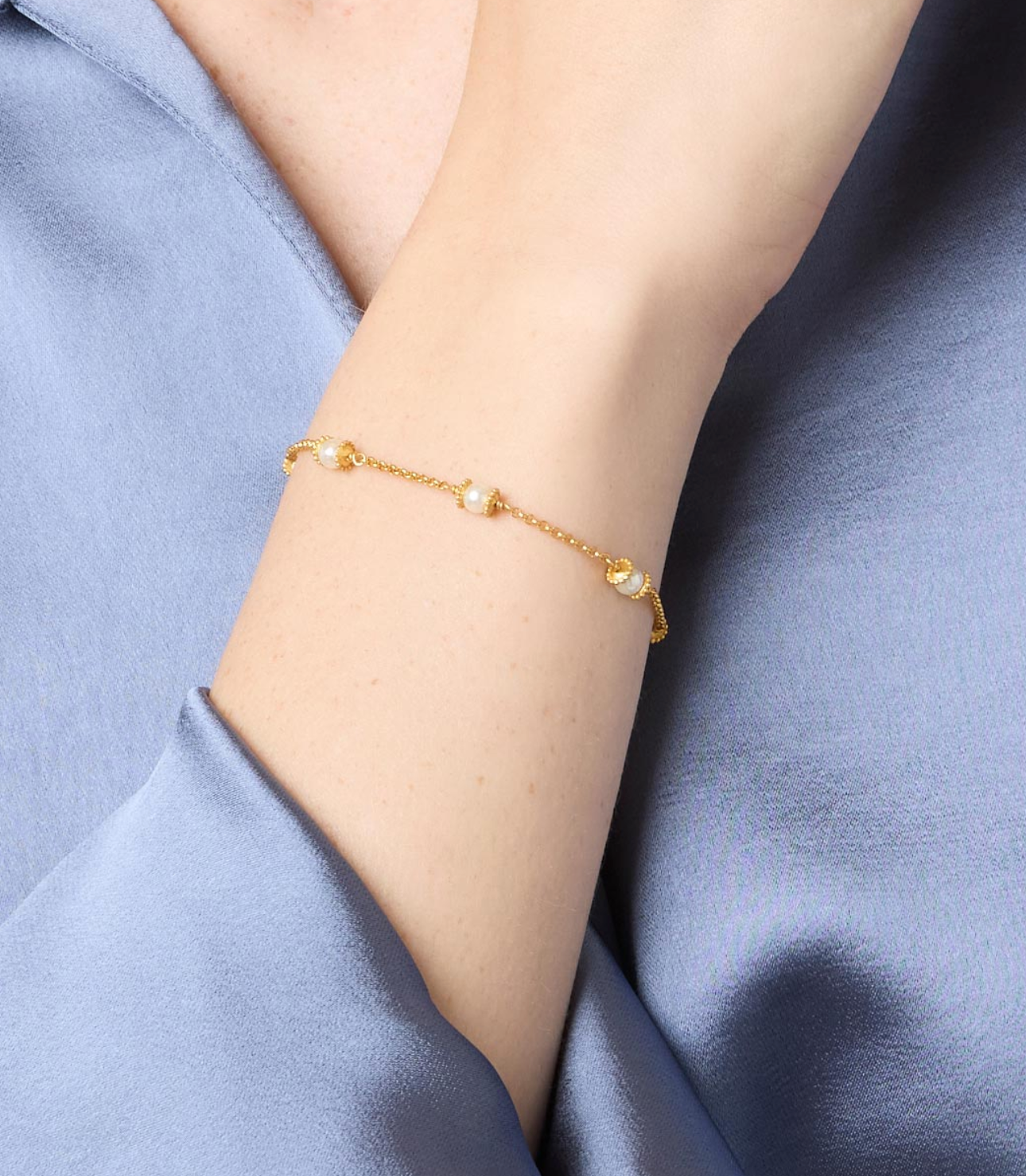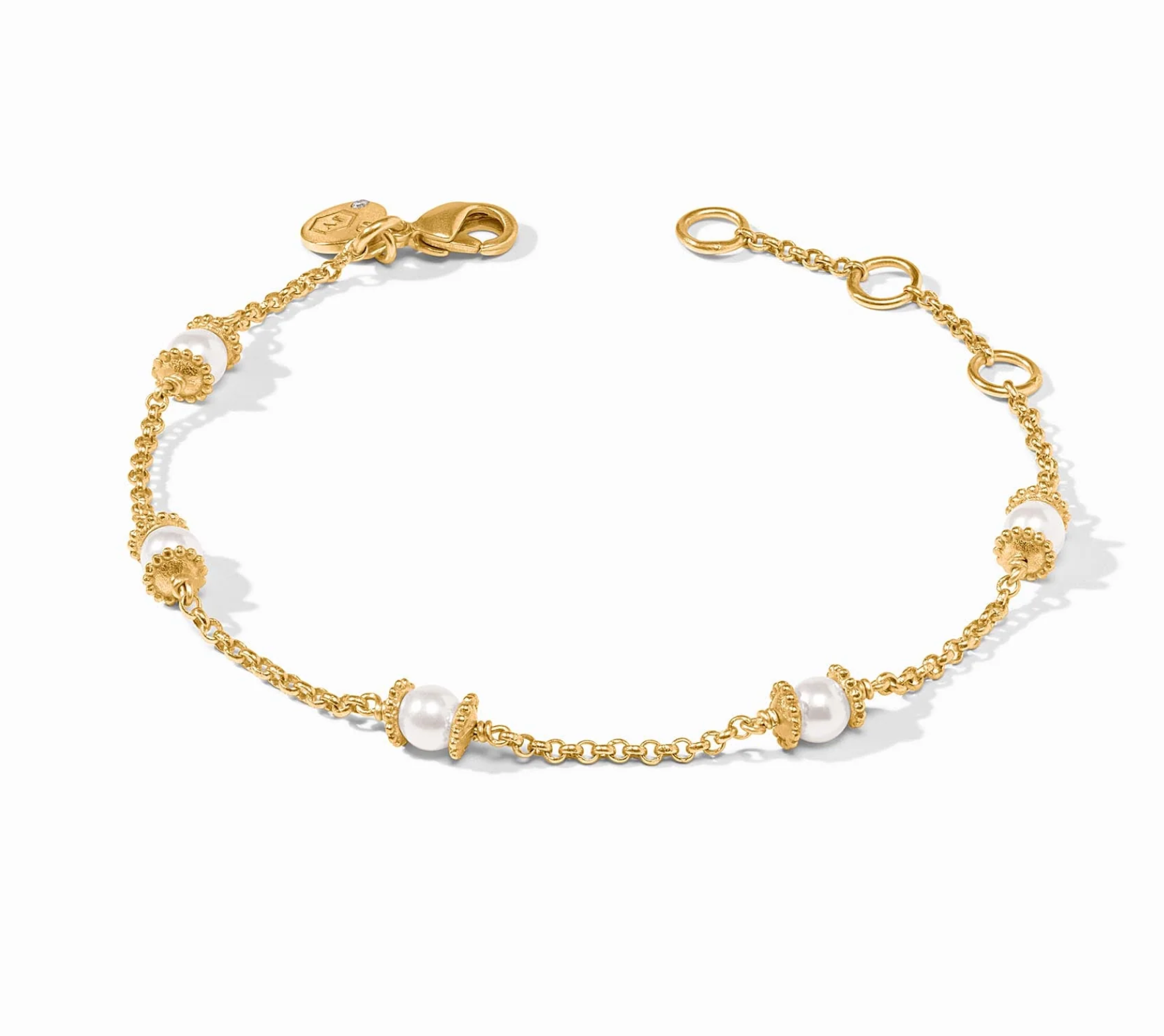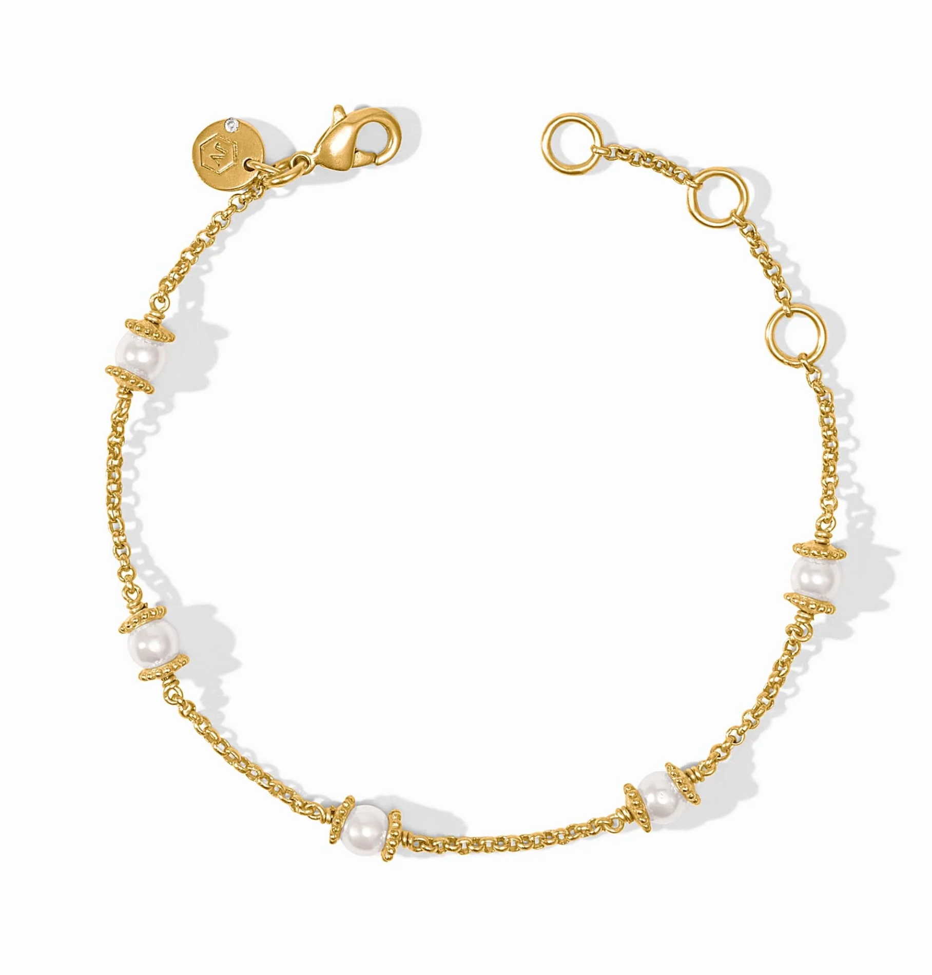 Perfectly polished gemstone spheres with finely beaded golden caps appear to float along this bracelet's delicate Venetian box chain. Features an adjustable closure.