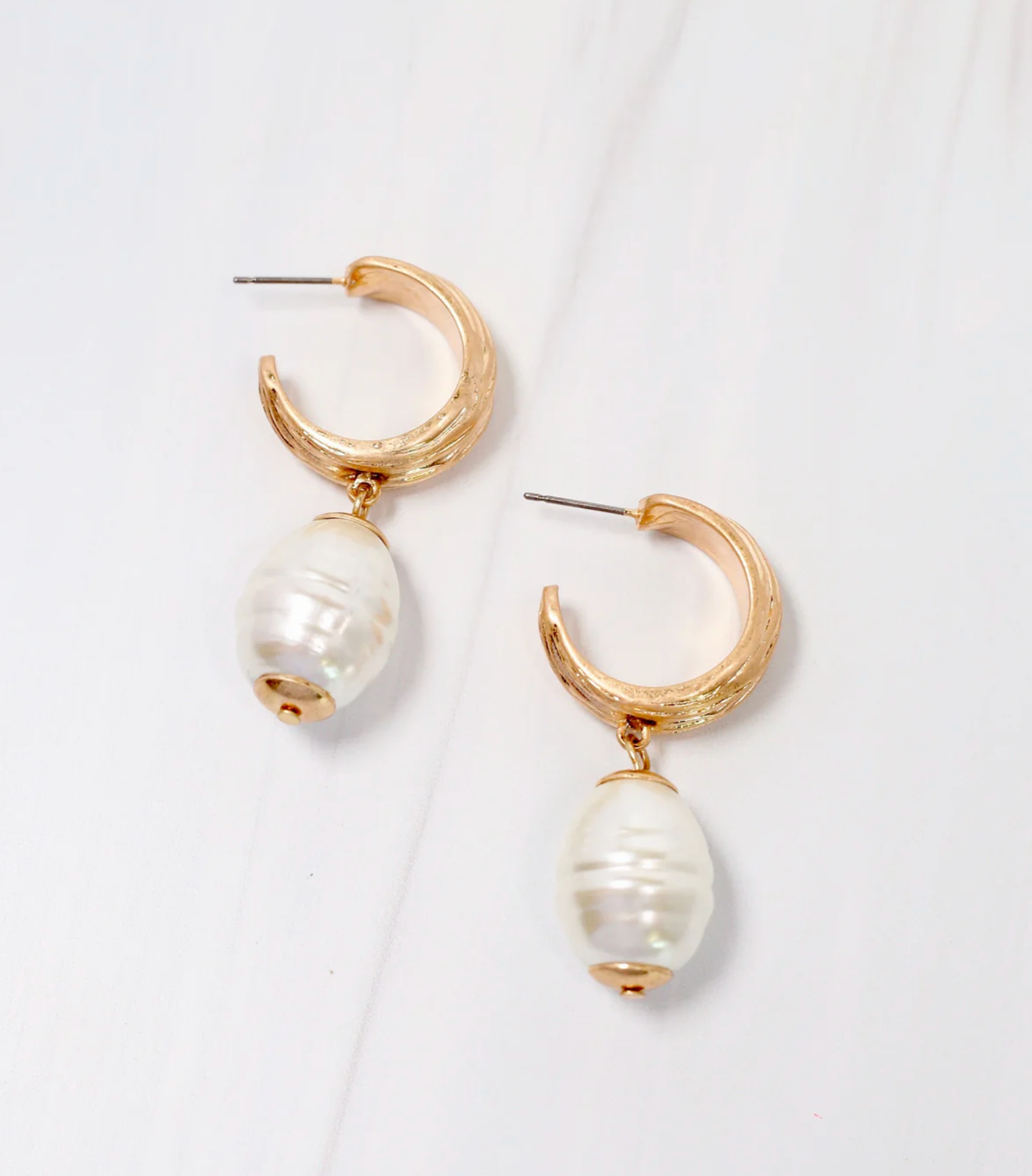 This hoop earring has a scratched texture design on a titanium post back. It also has a pearl drop accent as well.