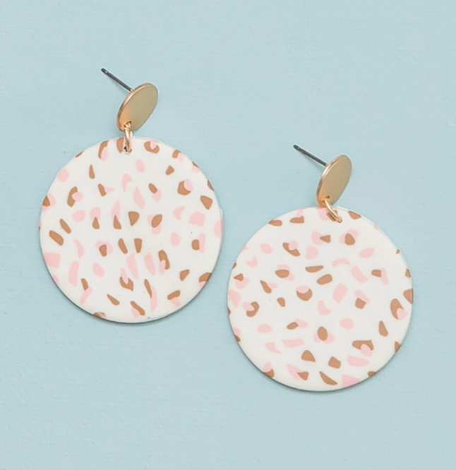 Polymer clay circle drop earrings, brass plated metal, 2.5", nickel and lead free, surgical steel posts, hypoallergenic