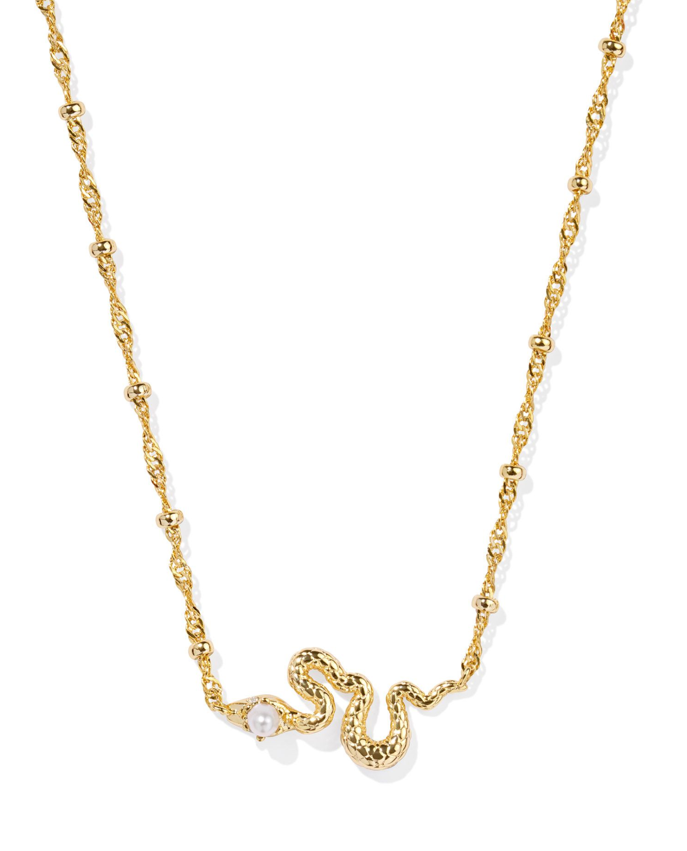 Full of texture, shine, and a little bit of edge, meet the Lyle Gold Snake Short Pendant Necklace in White Pearl. A powerful symbol of transformation, this sculptural snake pendant is embellished with a cultured freshwater pearl accent for added interest and a satellite chain for extra texture.