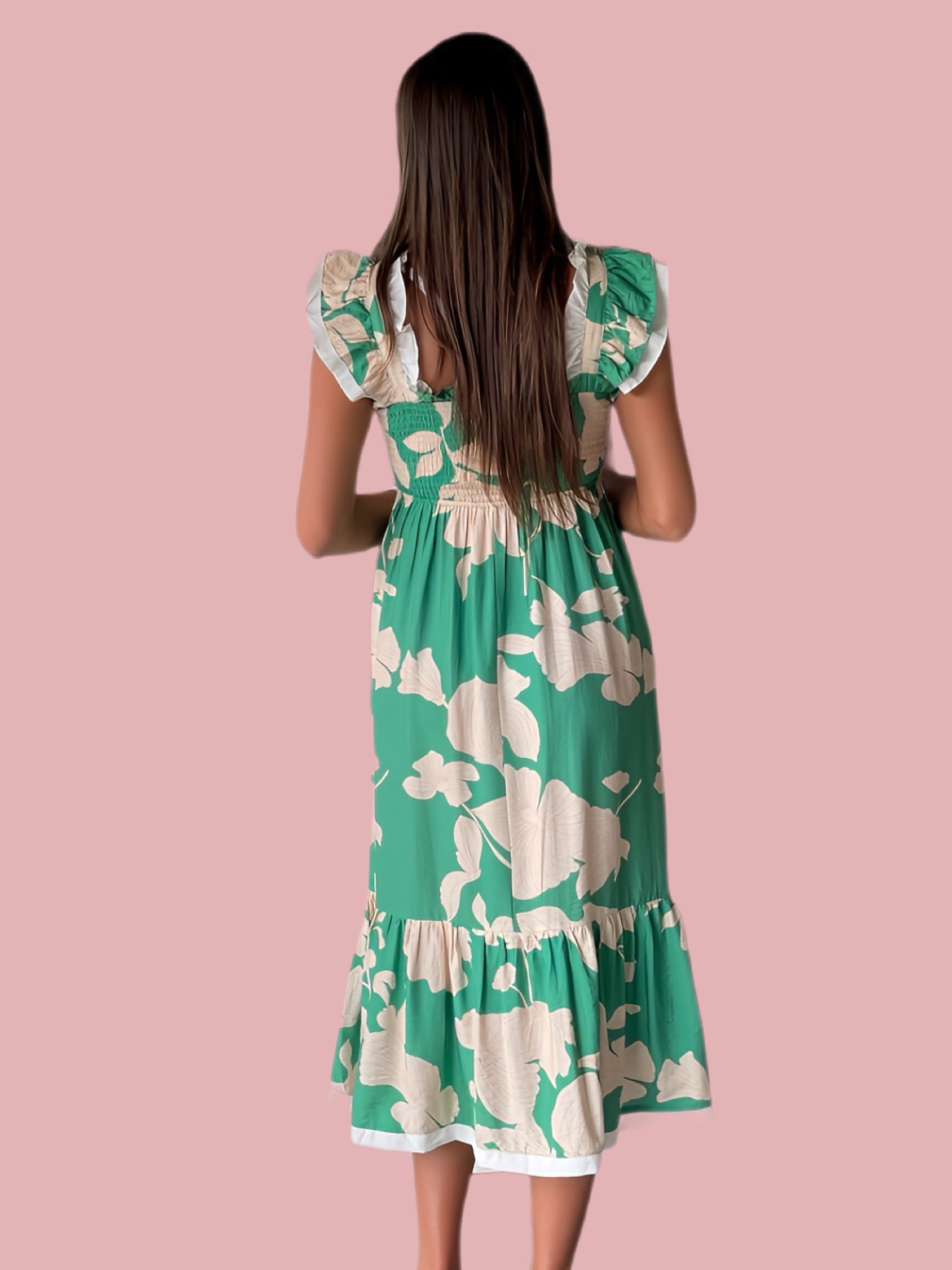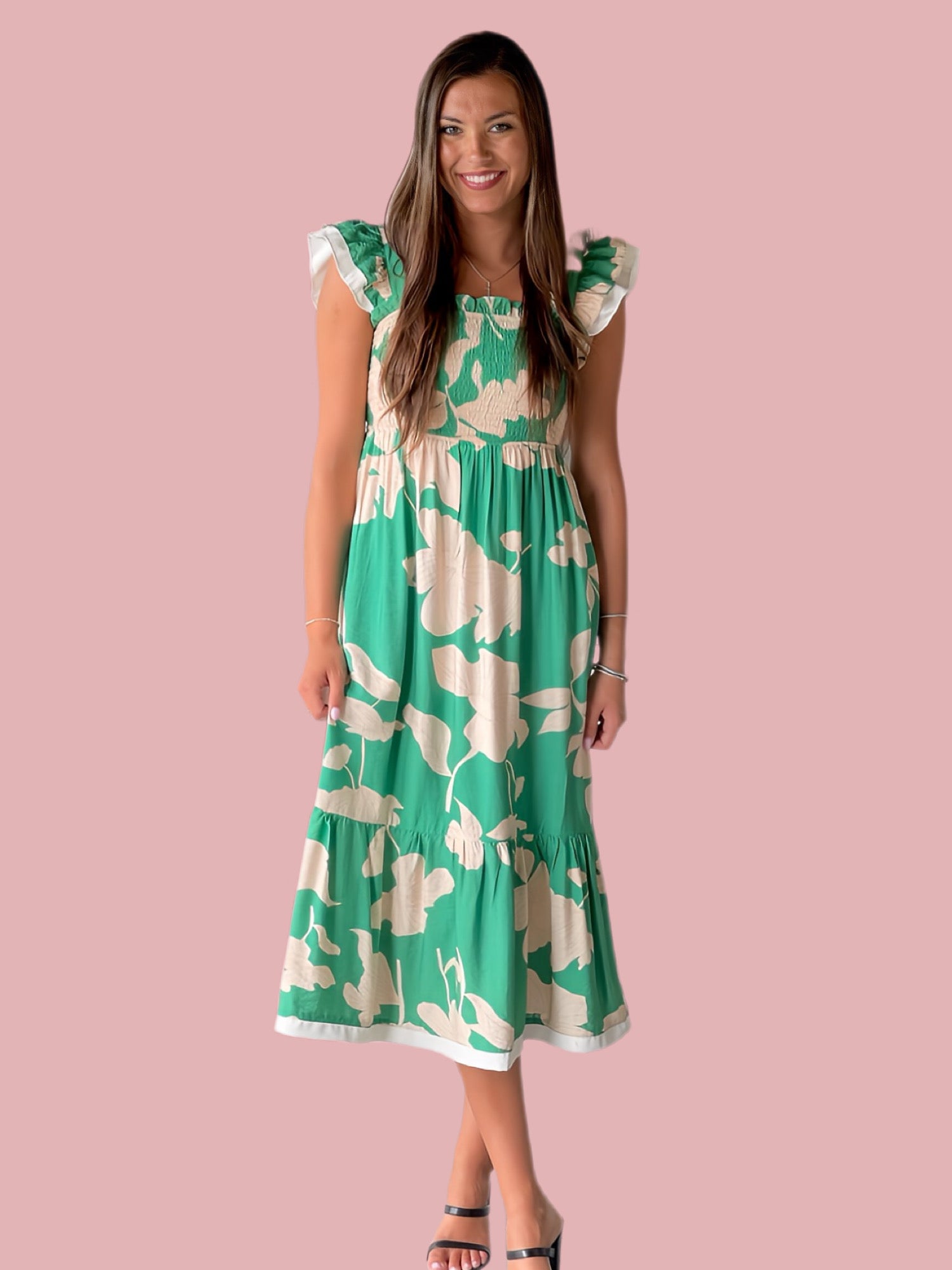 Expertly crafted with a smocked bodice and ruffle shoulder straps, the Meadow Muse Smocked Midi is a must-have for the fashion-forward woman. Its tiered midi-length skirt and delicate flower print add a touch of whimsy to its elegant silhouette. Stay comfortable and stylish with this versatile dress.