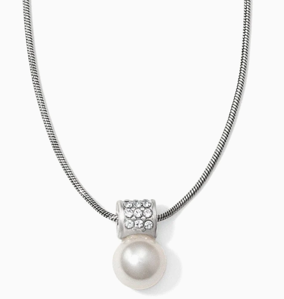 This delicate necklace is perfect for the woman who prefers dainty pieces. A fine quality glass pearl and half-barrel encrusted with pave fine quality crystals give it a fine jewelry look.