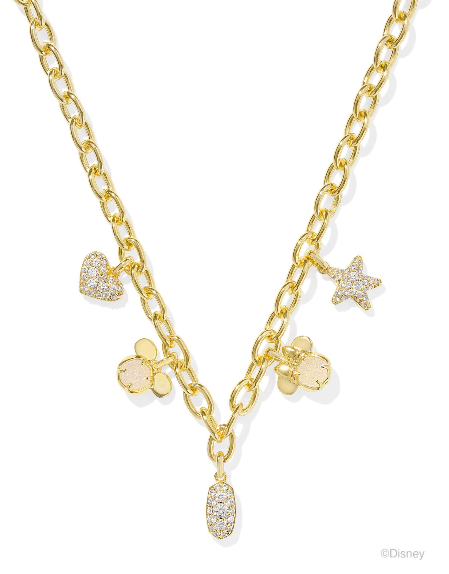 This MICKEY MINNIE CHARM NECKLACE GOLD IRIDESCENT WHITE MIX by Kendra Scott is a charming addition to any outfit. Crafted with gold and iridescent accents, it features iconic Mickey and Minnie charms. Perfect for fans of Disney and fashion lovers alike.