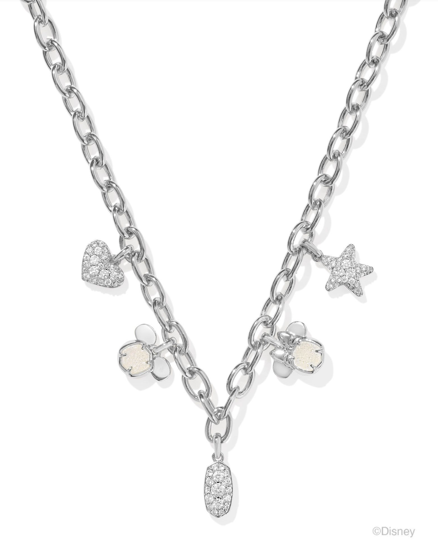 This MICKEY MINNIE CHARM NECKLACE by Kendra Scott features a charming combination of silver and iridescent white mix, adding a touch of sparkle to any outfit. Made with quality craftsmanship and attention to detail, this necklace is perfect for any fashion-forward individual looking to add a touch of Disney magic to their accessories collection.