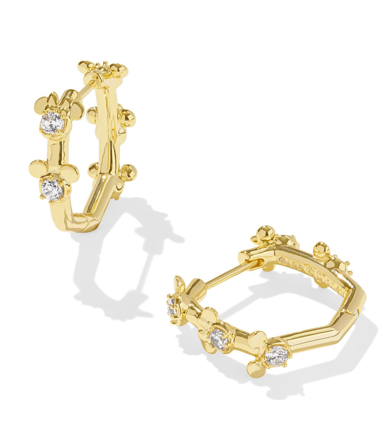 Expertly crafted by Kendra Scott, these MICKEY MINNIE HUGGIE EARRINGS feature stunning white crystals set in a luxurious gold setting. These earrings are not just a fashion statement, but a timeless piece of jewelry that will elevate any outfit with its elegant and chic design. Perfect for any occasion, these earrings will add a touch of sophistication to your look.