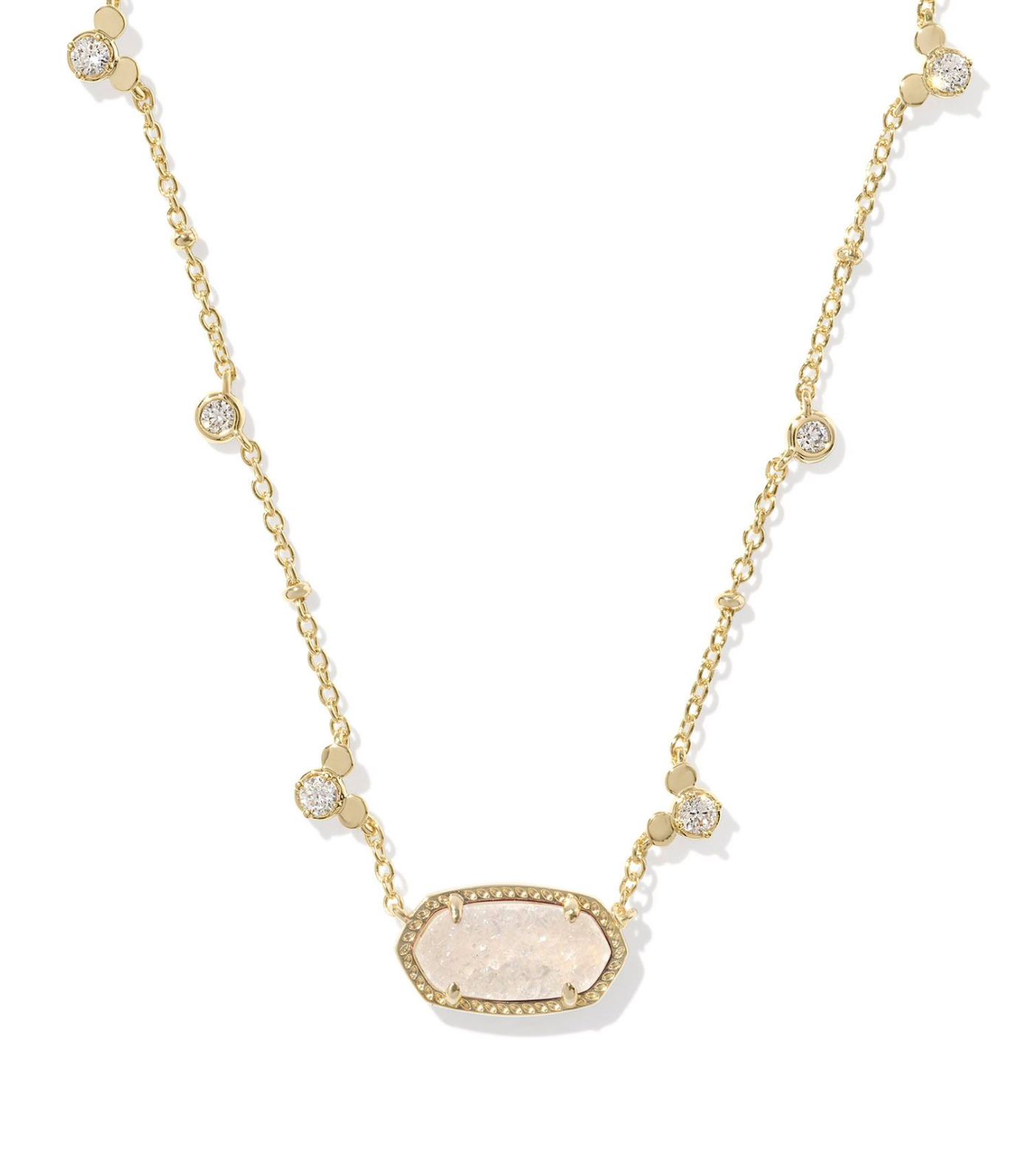 This MICKEY MOUSE ELISA NECKLACE by Kendra Scott features a stunning gold iridescent drusy stone, perfect for adding a touch of sparkle to any outfit. Expertly crafted, this necklace is a must-have for any fashionista looking to elevate their jewelry collection.