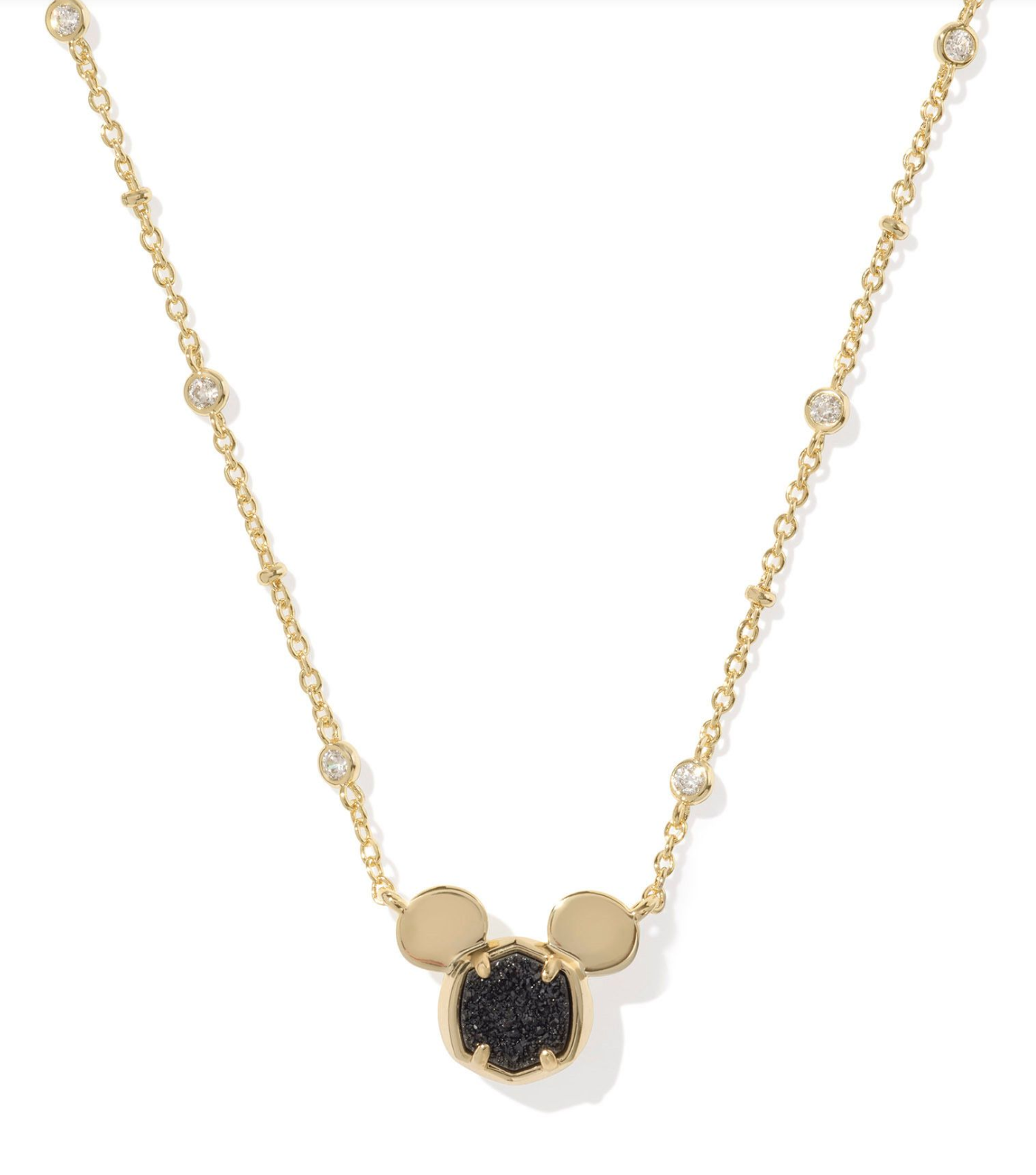 This elegant Mickey Mouse pendant necklace by Kendra Scott features a stunning black drusy stone set in a gold pendant. The combination of the bold black stone and classic Mickey Mouse silhouette creates a unique and timeless piece that is perfect for any Disney fan. Elevate your jewelry collection with this charming necklace.
