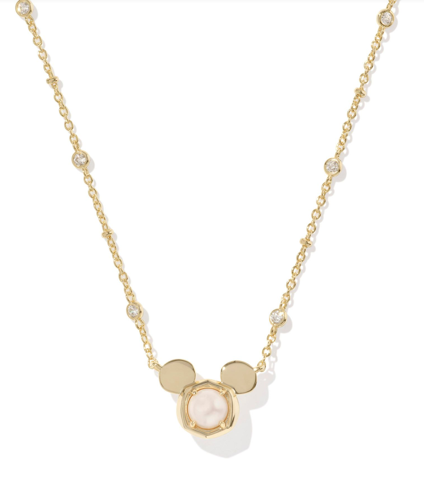 Expertly crafted by Kendra Scott, this Mickey Mouse pendant necklace shines in gold and boasts a beautiful white pearl. Bring a touch of magic to your wardrobe with this timeless piece that will elevate any outfit. Perfect for Disney fans and fashion lovers alike.