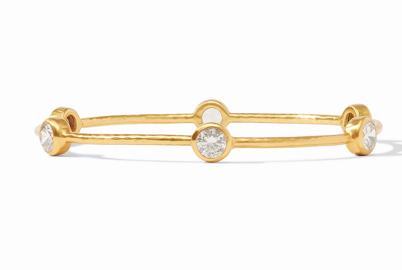 A lightly hammered bangle features six circular gemstones that sit along the length of this slim bangle, making it perfect for mixing and matching to create a striking color story on your wrist.