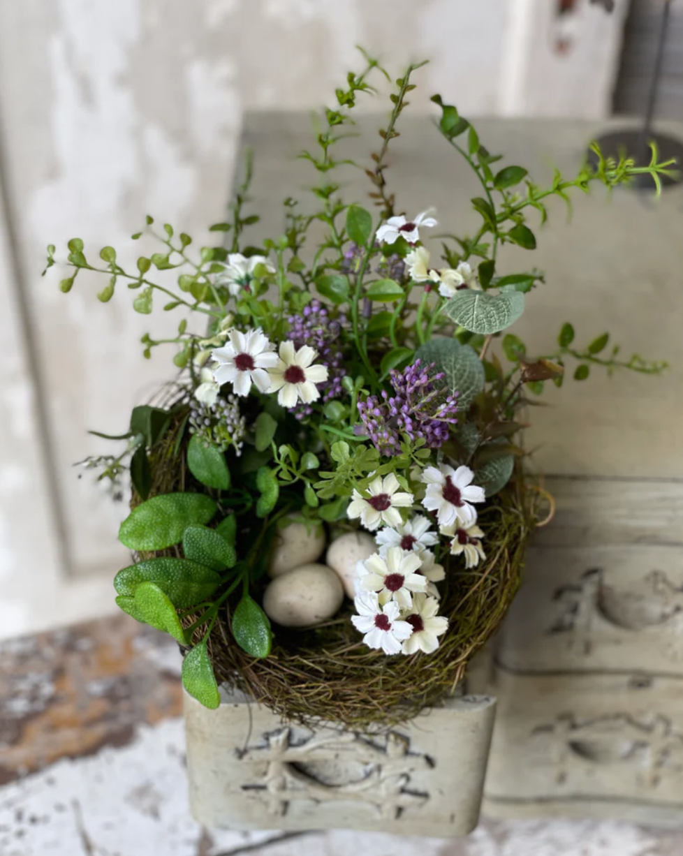 A bountiful assortment of woodland gems! Mixed greenery makes a pretty background for white daisies and purple seed heads tucked around a sweet nest with three eggs. Two sizes available, each sold separately.