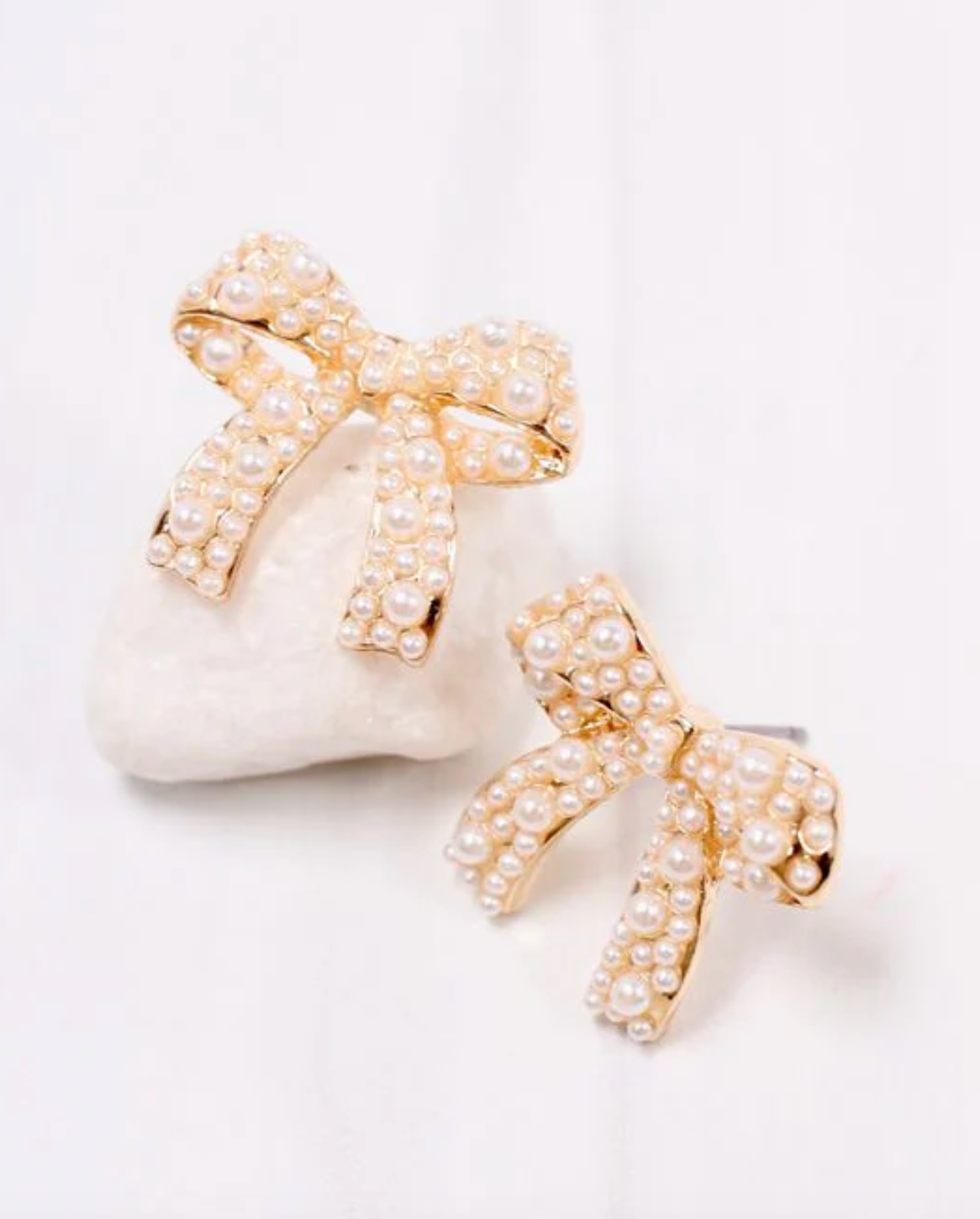 This metal bow is covered in pearls and on a post back. A gorgeous little accessory to wear dressy or casual.