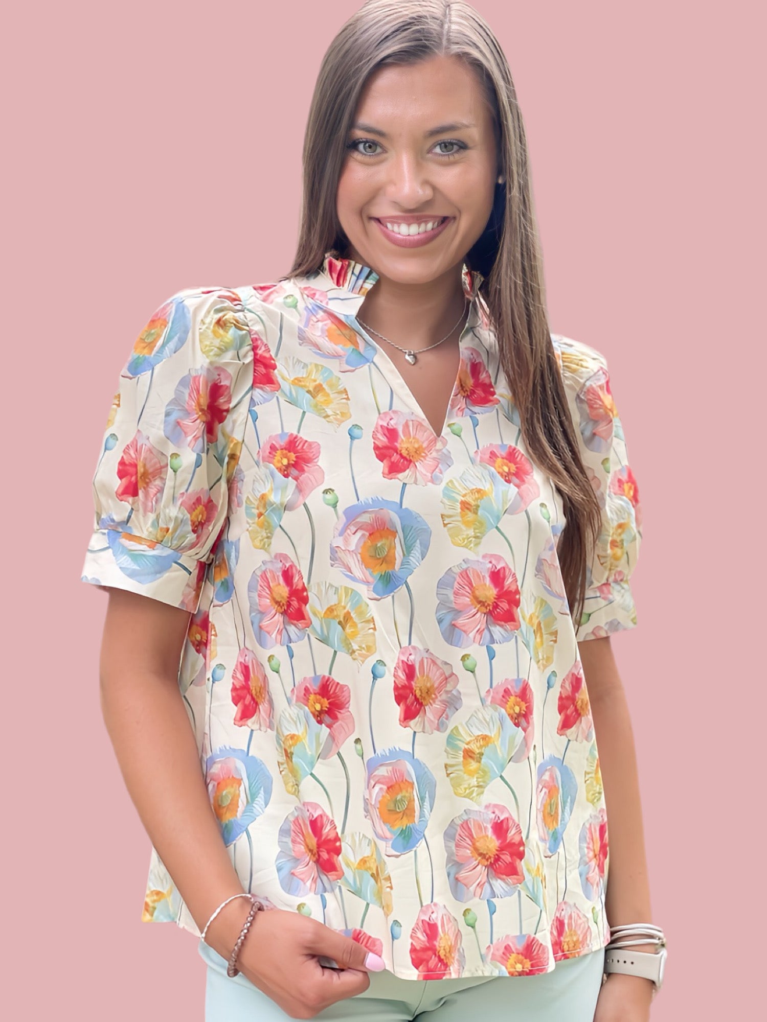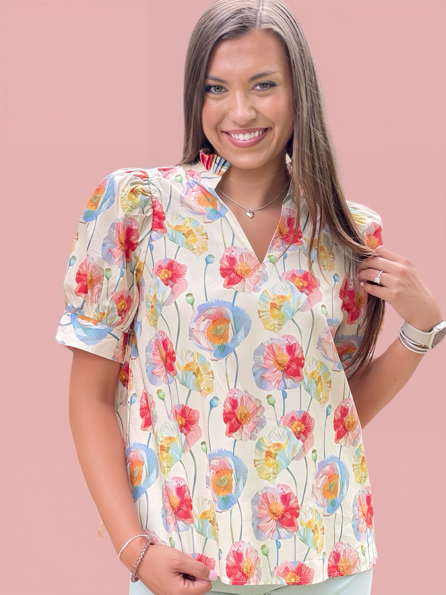 This lightweight pullover top showcases a delicate floral print with short puff sleeves and a pleated band collar that frames a split V-neck for a refined silhouette. Crafted from woven fabric, it offers a non-sheer, unlined design that ensures comfort and breathability. Ideal for layering or wearing alone, this top combines subtle elegance with everyday wearability.