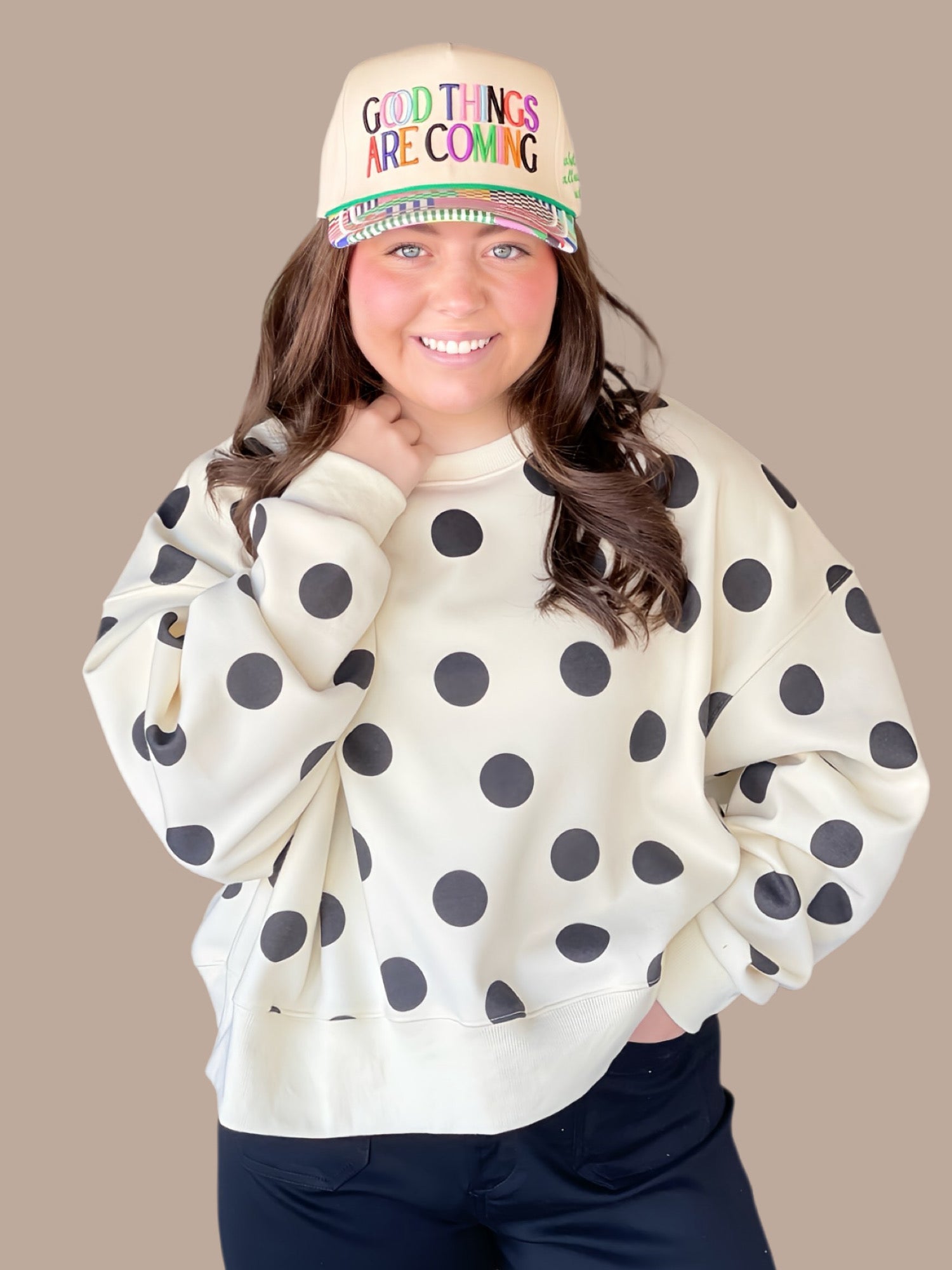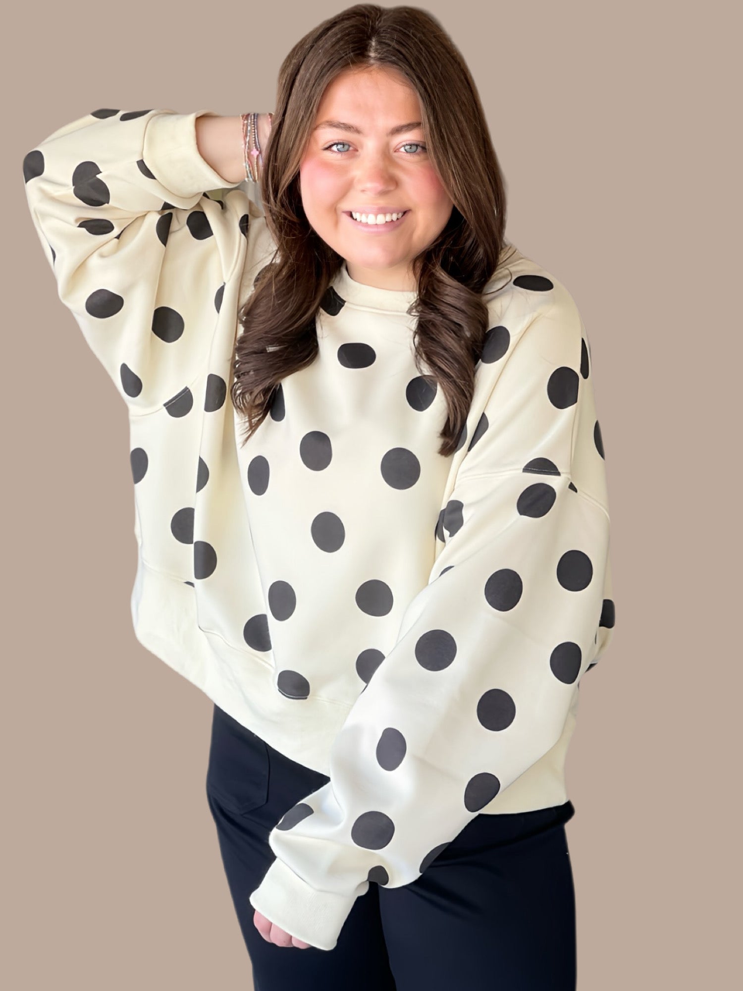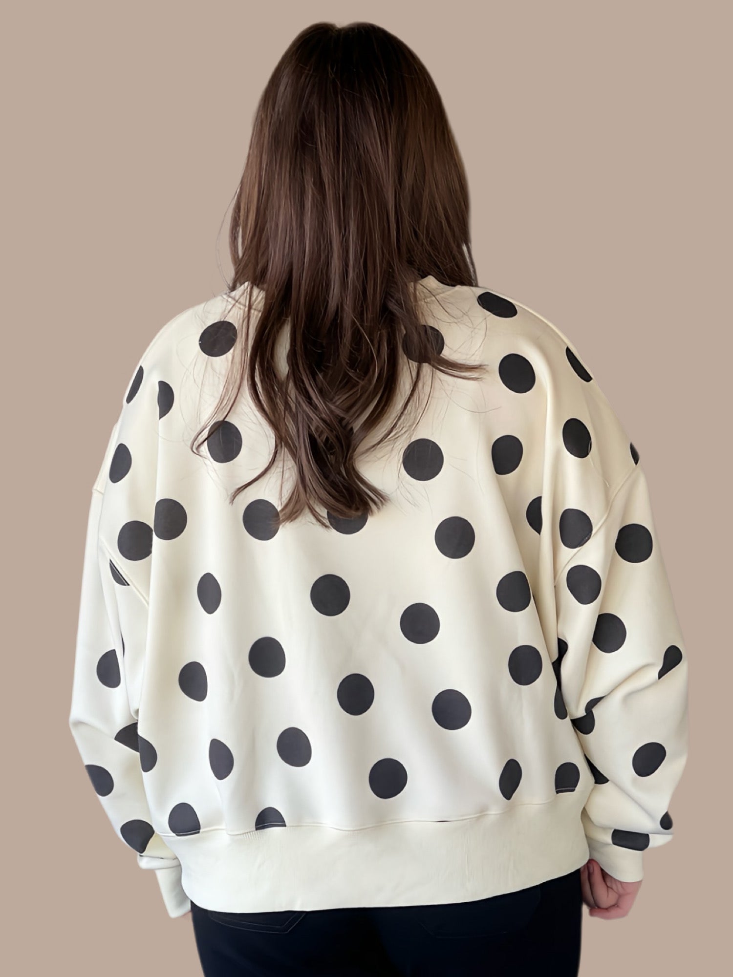 Poppy & Pine's crop sweatshirt combines playful style with practical comfort. The classic black and ivory polka dot pattern offers versatile appeal, while the cropped silhouette delivers a modern, flattering fit. Our model, standing 5'5", wears a size S/M for an intentional, slightly oversized look. Crafted for longevity, this piece requires gentle care—hand wash cold with similar colors, lay flat to dry or dry clean, and avoid bleach to maintain its vibrant finish.