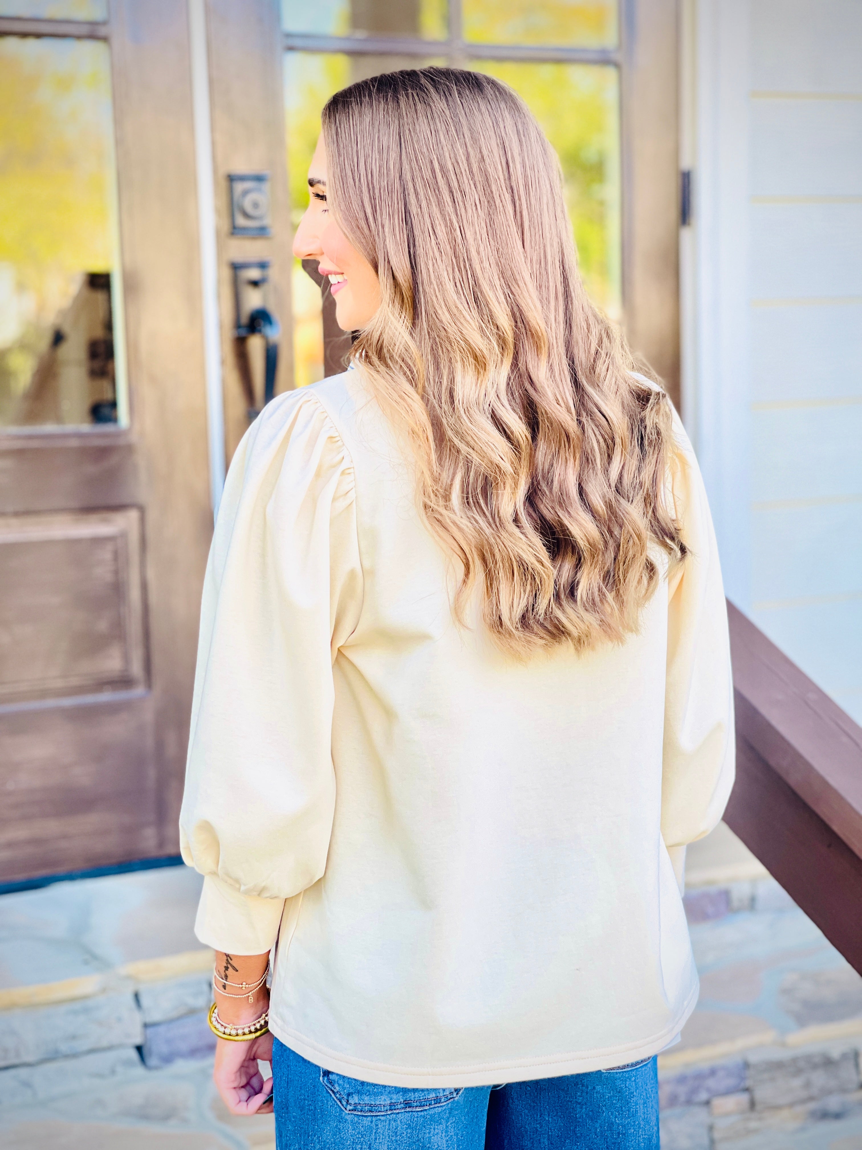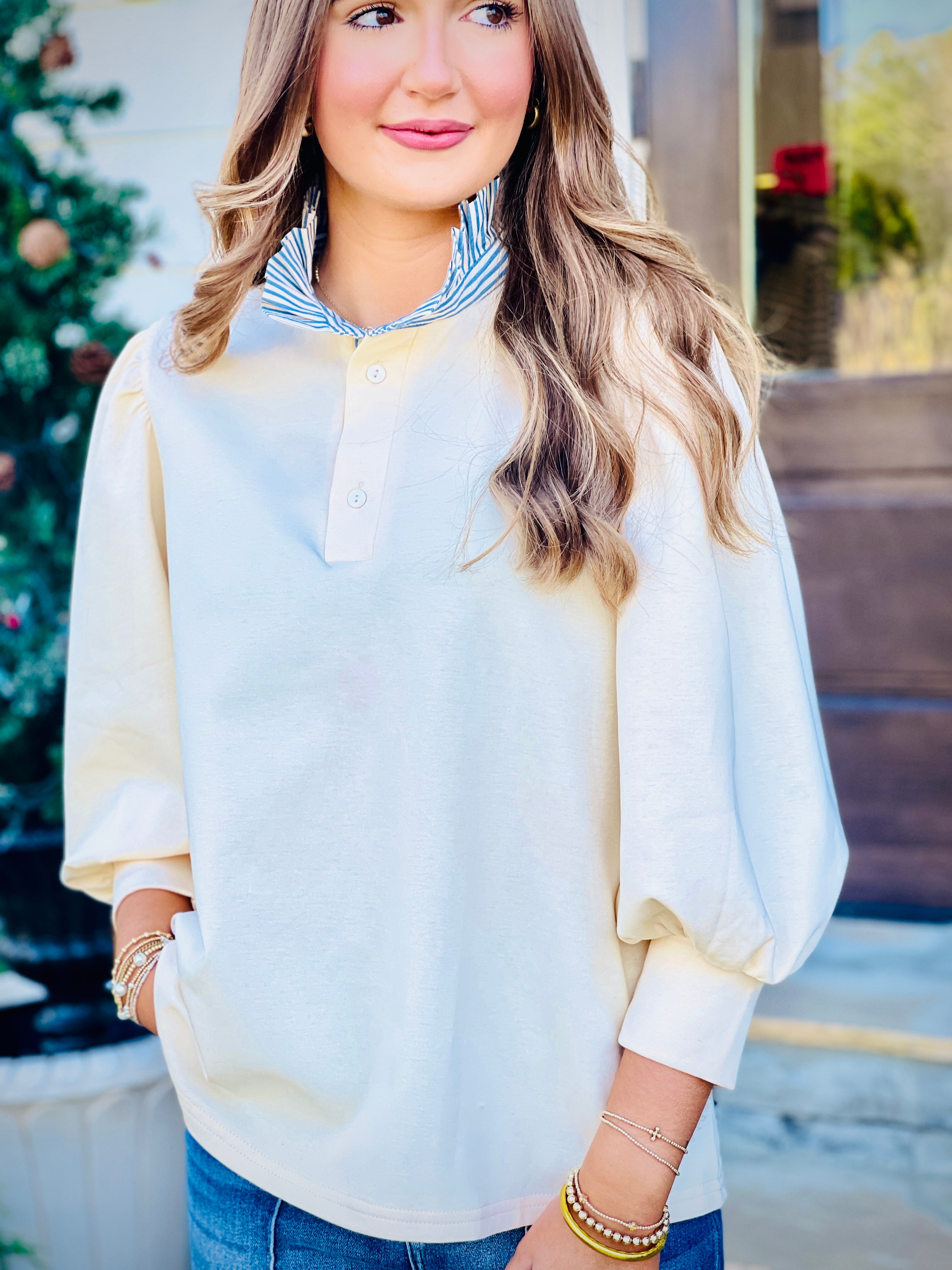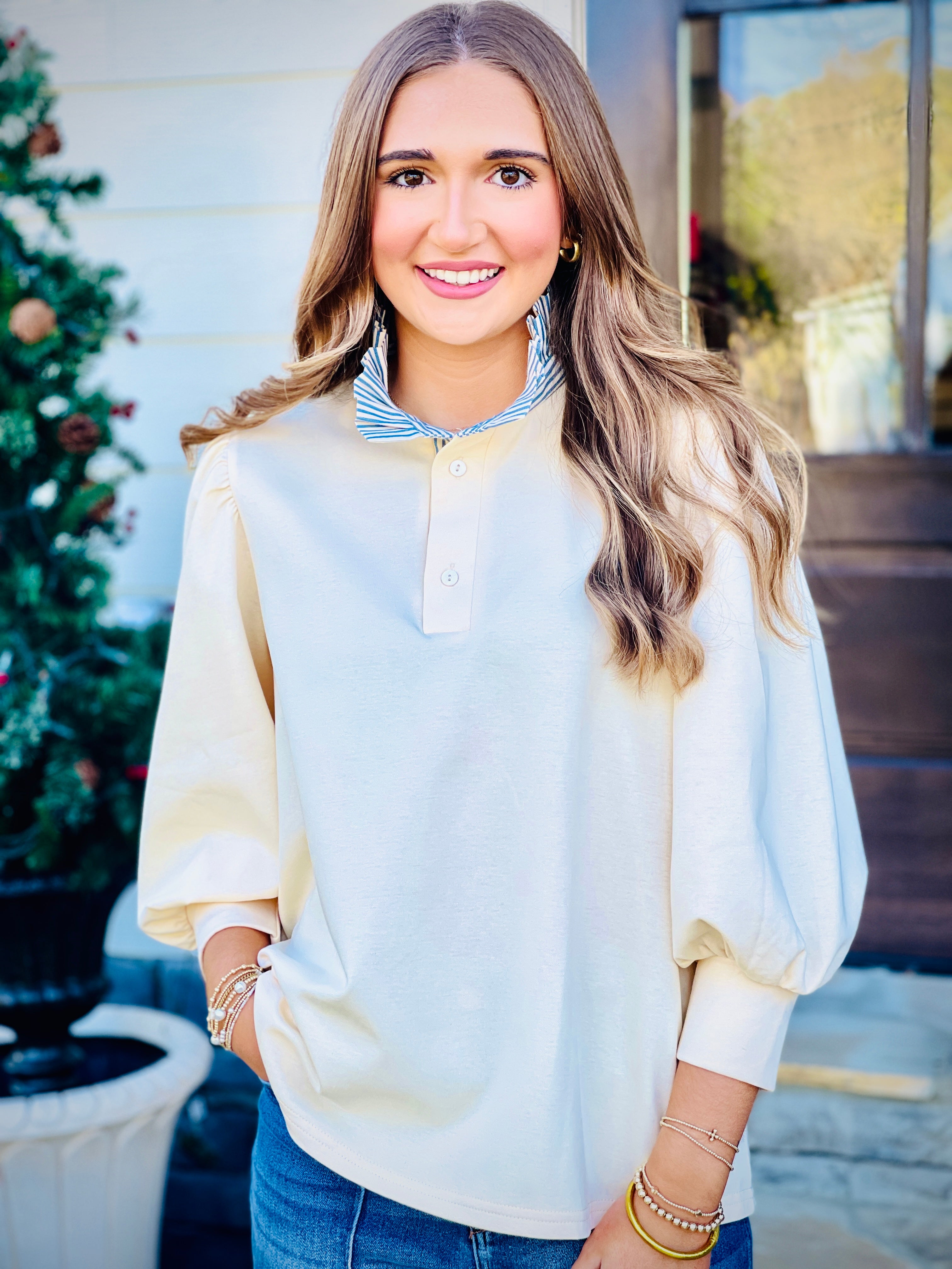 Introducing our new Solid Balloon Sleeve Popover Top! This stylish top features a half button front closure and contrast ruffle neck, adding a touch of elegance to any outfit. The knit material makes it lightweight and perfect for any season, while remaining non-sheer. Upgrade your wardrobe with this must-have piece.