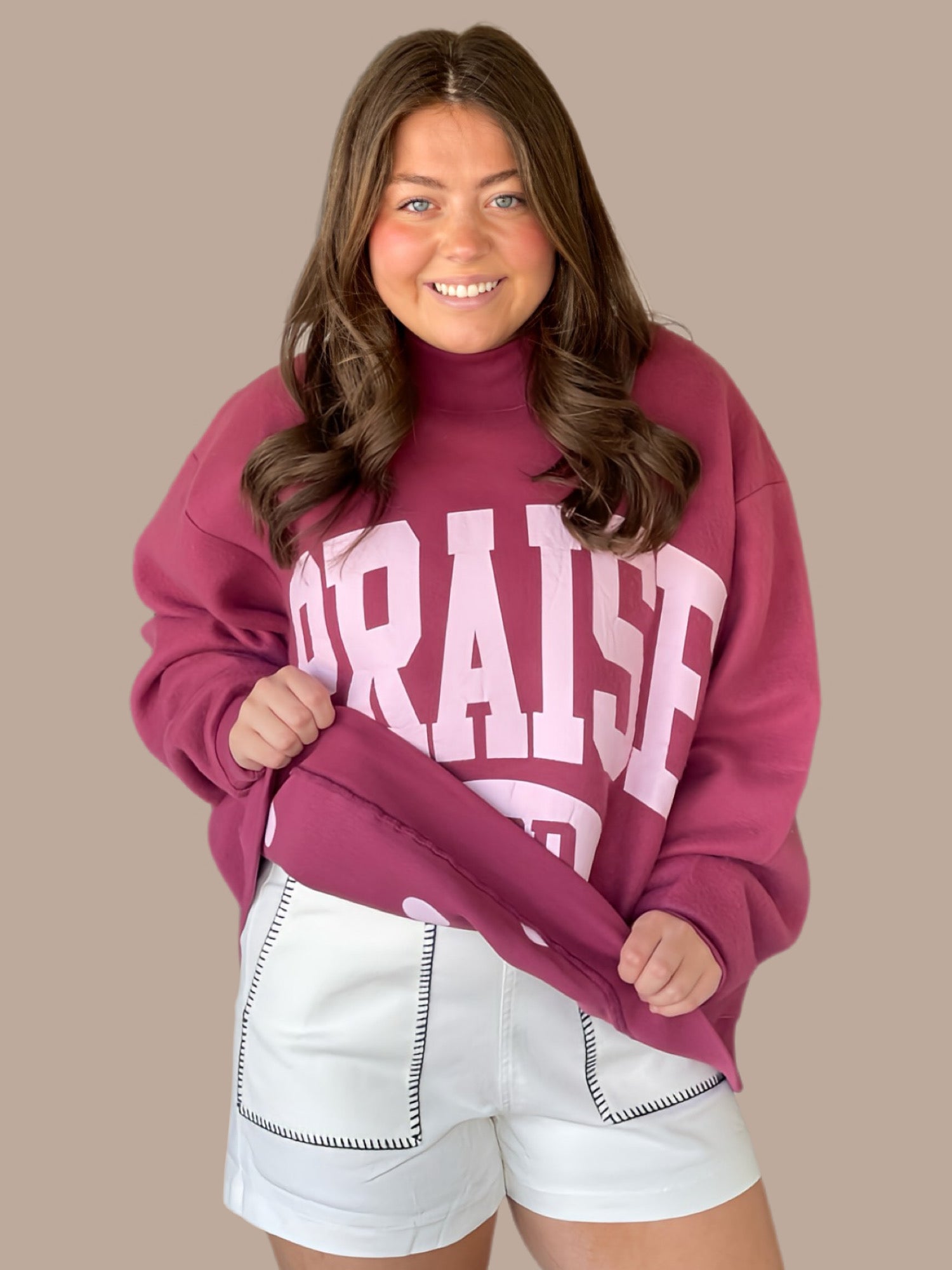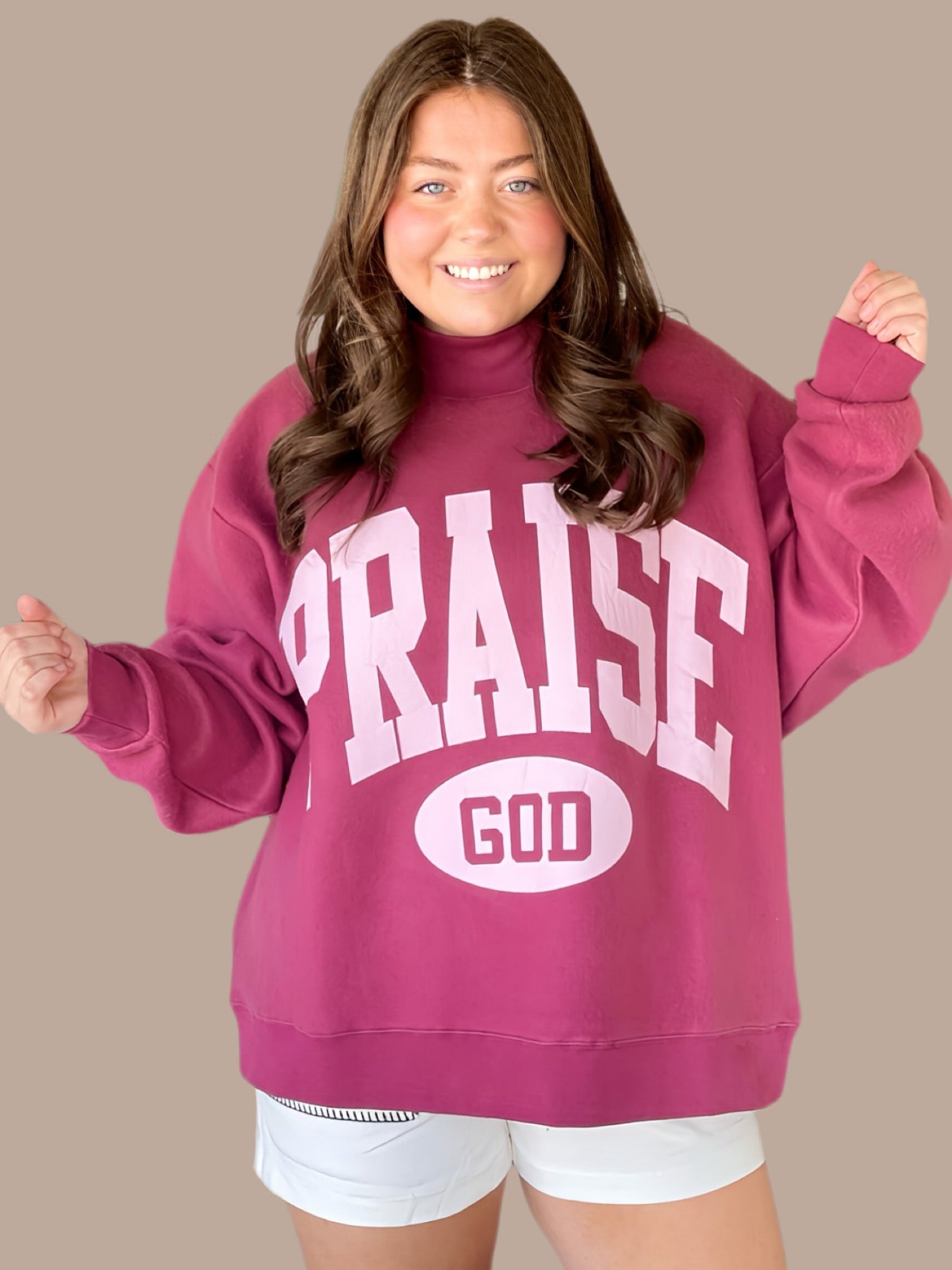 Praise God 2-Sided Mock Sweatshirt This bestselling reversible mock neck delivers authentic vintage character through inside-out printing and natural texture variations that make each piece distinctly individual. The exterior fleece features a lived-in comfort aesthetic with gentle pilling that develops naturally over time—a hallmark of quality sweatshirt construction. The broken-in lettering effect is inherent to printing on fleece, amplifying the garment's vintage appeal. Crafted from a 60/40 fleece blend, it offers warmth without bulk. Hand wash cold with like colors; lay flat or dry clean. Model is 5'5" wearing size S/M.