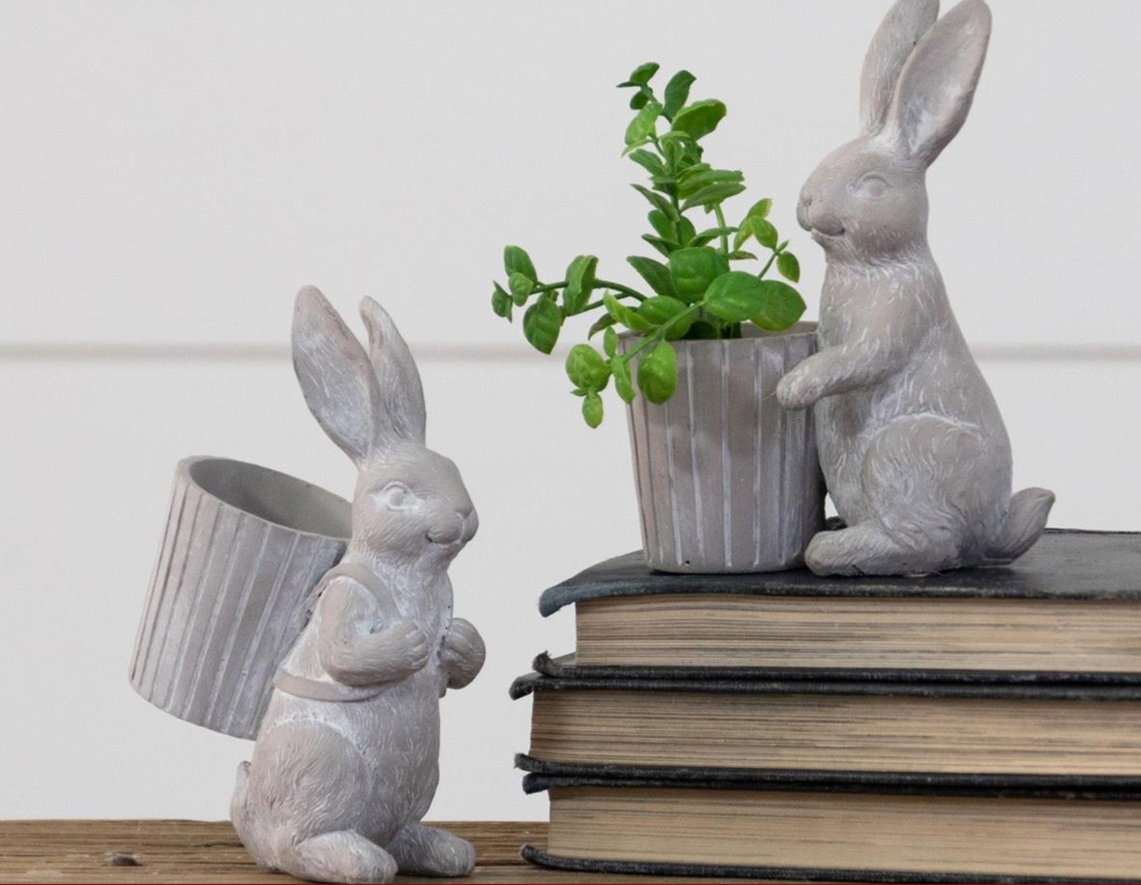 Expertly crafted using stonepowder and resin, these adorable rabbits with baskets are the perfect addition to your home decor. Standing 6" tall with dimensions of 3" W x 4.5" D and 2" W x 4" D, these charming figurines also make great props for creative displays.