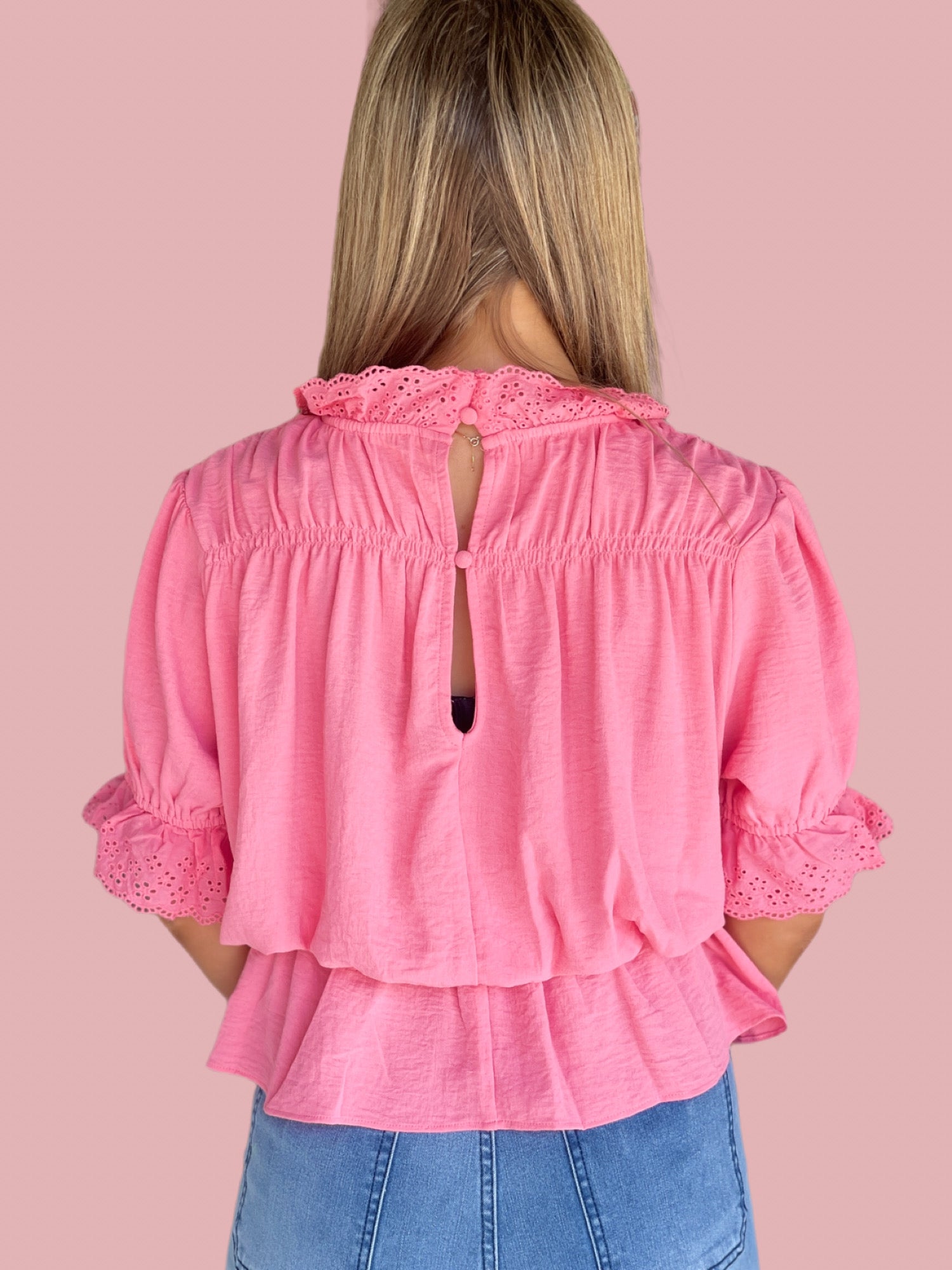 The Smocked Ruffle Peplum Blouse features a high ruffle neckline with delicate eyelet lace trim, adding a touch of femininity. The smocked bodice creates a flattering and comfortable fit, while the short puff sleeves with ruffle cuffs add a playful touch. The peplum hem adds a flirty and stylish flair. Not lined for a lightweight and breezy feel.